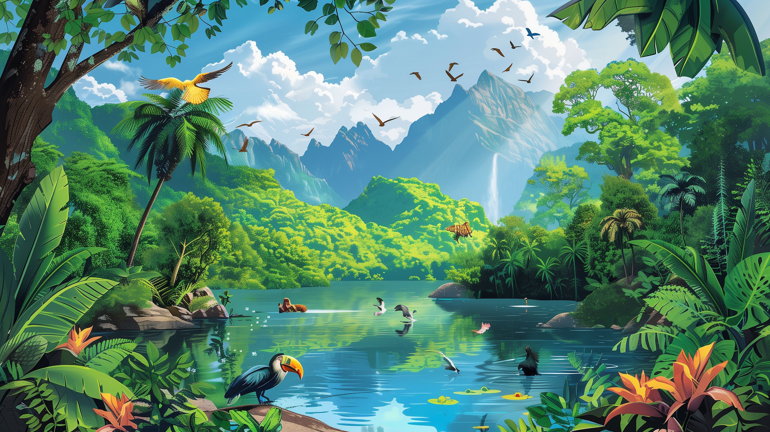 Dieses idyllische Dschungelpanorama zeigt eine üppige tropische Landschaft mit Bergen, Wasserfällen und kristallklaren Seen. Bunte Vögel wie ein Tukan fliegen über die saftig grüne Vegetation, während Affen und andere Tiere die Gewässer und Felsen bevölkern. Die farbenfrohe Szene strahlt einen Hauch von Abenteuer und Entdeckerfreude aus und eignet sich hervorragend als stimmungsvolles Hintergrundbild für Blog-Artikel, Social-Media-Beiträge oder Werbekampagnen rund um Themen wie Reisen, Naturschutz oder Outdoor-Aktivitäten. Dieses hochauflösende Stockfoto ist unter der Creative-Commons-Lizenz kostenlos nutzbar.