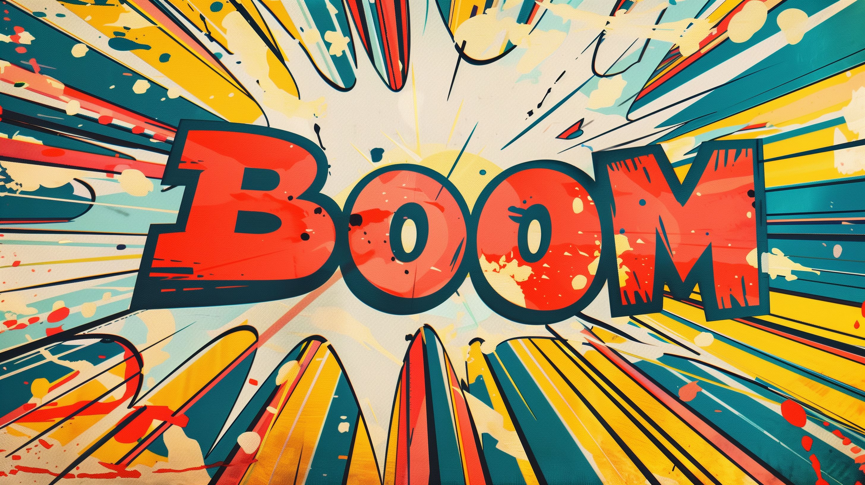 Dieses farbenfrohe Bild zeigt eine explosionsartige Comic-Darstellung mit einem kräftigen 'Boom'-Effekt. Die Gestaltung erinnert an den Retro-Stil der 1960er Jahre mit seiner markanten Pop-Art-Ästhetik. Die Komposition ist dynamisch und voller Energie, wobei die leuchtenden Farben Rot, Gelb und Blau dominieren und eine spielerische, humorvolle Stimmung erzeugen.