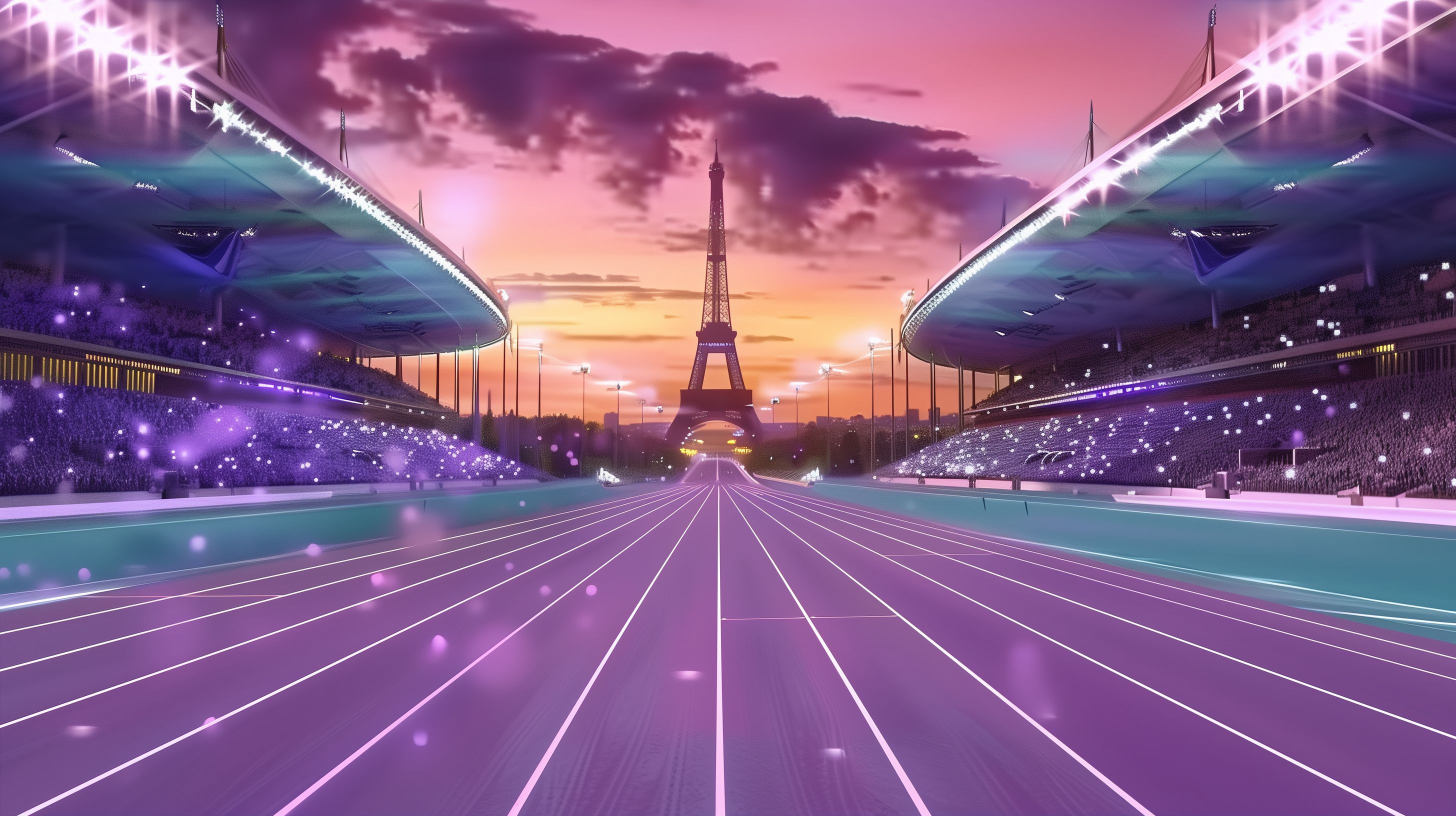 Dieses faszinierende Bild zeigt eine leuchtende Rennstrecke mit Blick auf den Eiffelturm in Paris. Der Himmel erstrahlt in einem satten Lila und Magenta, durchzogen von dramatischen Wolkenformationen. Die Rennstrecke selbst ist in einem hellen Türkis gehalten und wird von gleißenden Lichtern gesäumt, die eine Dynamik und Spannung vermitteln. Im Hintergrund thront majestätisch der Eiffelturm, der das Wahrzeichen Frankreichs symbolisiert. Dieses Bild weckt Assoziationen zu den Olympischen Spielen und bietet sich ideal für den Einsatz in Sportberichten, Eventmaterialien oder als attraktiver Hintergrund für digitale Anwendungen an. Als hochauflösendes, kostenloses Stockfoto unter Creative-Commons-Lizenz ist es perfekt für den Einsatz in Blogs, Websites oder Präsentationen geeignet.