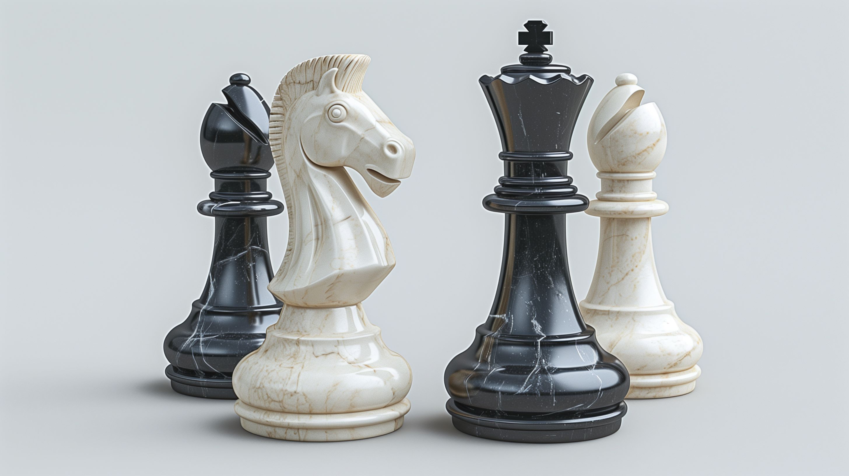 Das Bild zeigt eine Anordnung von eleganten Schachfiguren in Marmor-Optik. Die schwarzen und weißen Figuren, bestehend aus König, Dame, Turm, Läufer und Springer, sind vor einem neutralen Hintergrund angeordnet. Die Figuren sind detailliert und hochwertig gestaltet, mit einer glatten, glänzenden Oberfläche, die an Marmor erinnert. Diese Darstellung der klassischen Schachfiguren in einem modernen, minimalistischen Stil eignet sich hervorragend als Titelbild für Blogbeiträge, Newsletter oder Social-Media-Posts rund um Strategie, Wettbewerb, Geschäfts- oder Bürokonzepte. Als hochwertiges, kostenloses Stockfoto in hoher Auflösung und unter Creative-Commons-Lizenz kann es vielfältig eingesetzt werden.