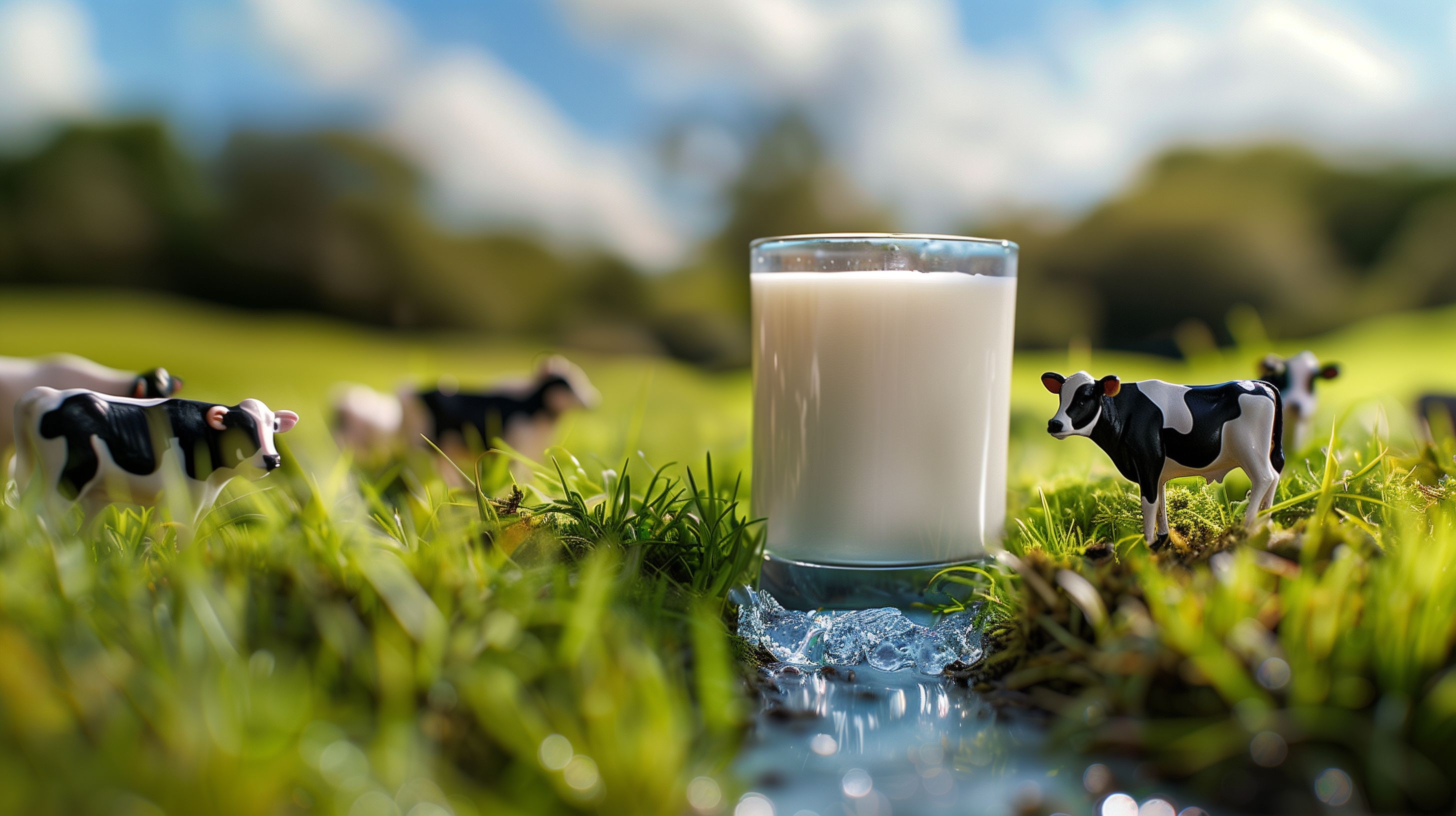 Das Foto zeigt eine idyllische Milchpause auf einer grünen Wiese. Im Vordergrund ist ein Glas mit frischer, cremiger Milch zu sehen, umgeben von saftigen Grashalmen und kleinen Kuhfiguren. Der Hintergrund ist verschwommen, aber lässt eine ländliche Landschaft mit Bäumen und einem wolkenverhangenen Himmel erkennen. Die Perspektive und Farbgebung erzeugen ein harmonisches und natürliches Gesamtbild, das Ruhe, Frische und Ursprünglichkeit vermittelt. Dieses Foto eignet sich hervorragend als kostenloses Stockfoto für Blogs, Newsletter, Social-Media-Kanäle oder Werbematerialien rund um Themen wie Bio, Ökologie, Nachhaltigkeit oder Landwirtschaft. Die hohe Auflösung und Creative-Commons-Lizenz erlauben eine vielseitige Nutzung.