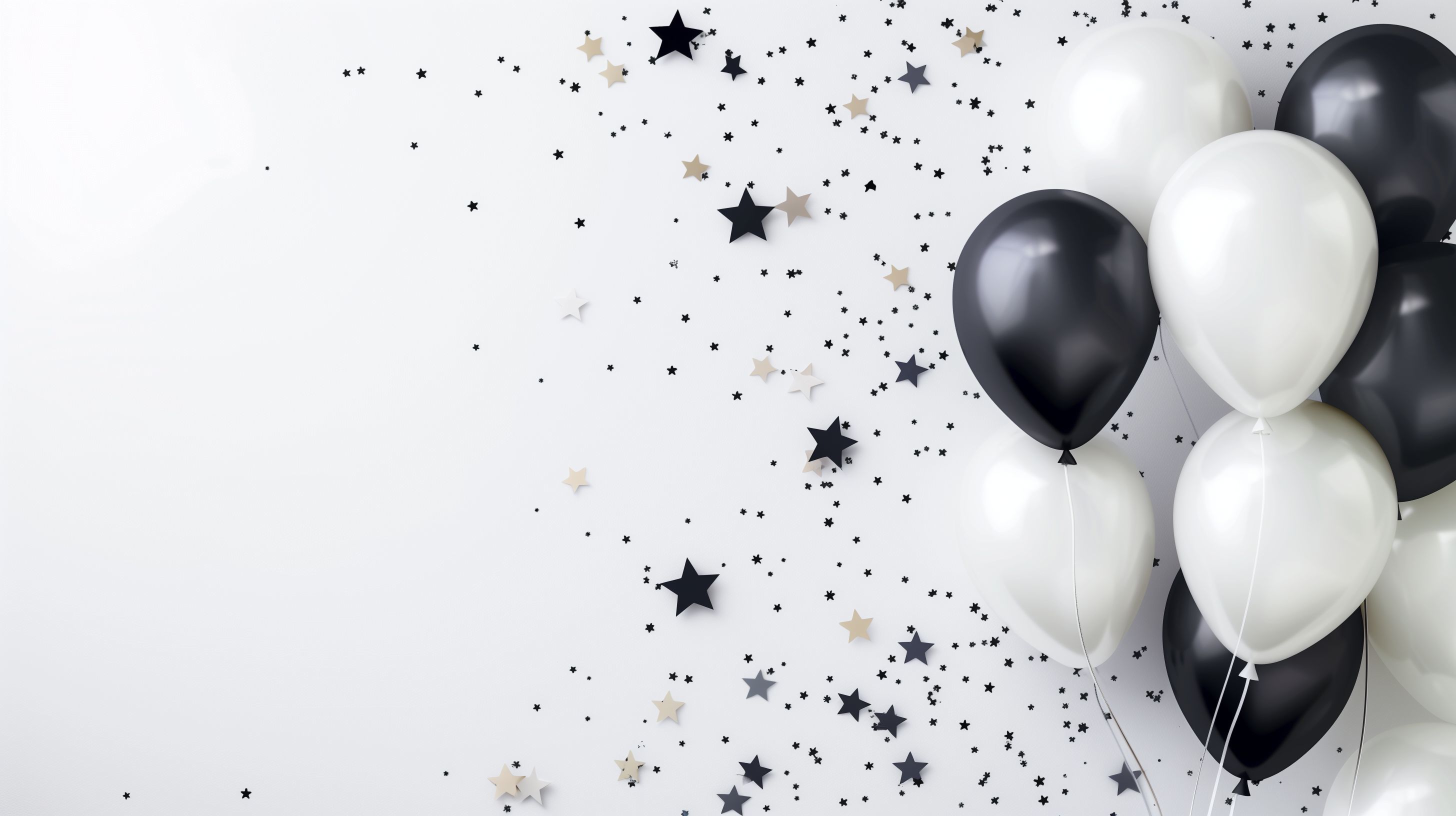 Dieses Foto zeigt eine stimmungsvolle Feierkulisse mit schwarzen und weißen Luftballons sowie funkelnden Sternen vor einem hellen Hintergrund. Die Komposition und das Farbschema verleihen der Szene eine elegante und festliche Ausstrahlung, die sich perfekt für Dekorationen und Hintergründe zu besonderen Anlässen wie Geburtstage, Hochzeiten oder Silvester eignet. Das hochauflösende Stockfoto ist unter einer Creative-Commons-Lizenz kostenlos für kommerzielle und private Zwecke nutzbar.