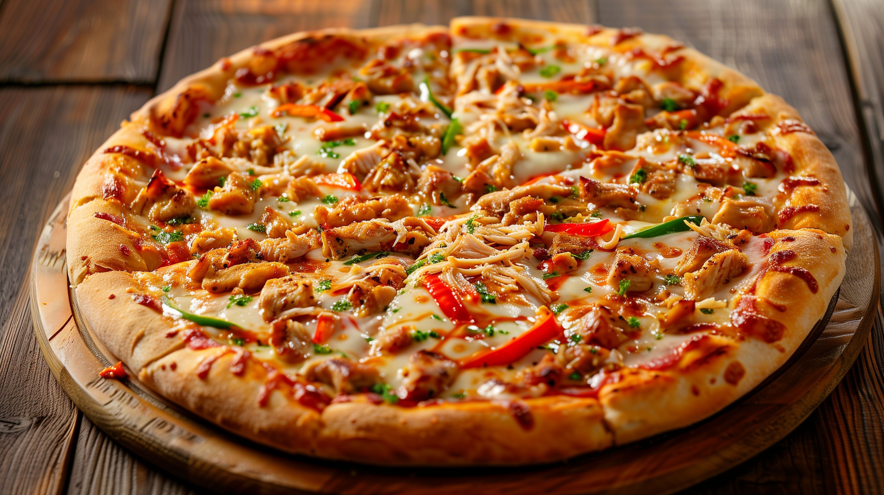 Dieses Foto zeigt eine köstliche, ofenfrische Hühnchen-Pizza mit bunt gemischten Zutaten wie Tomate, Paprika und Käse auf einem rustikalen Holztisch. Die Pizza strahlt eine appetitliche Frische aus und lässt den Betrachter das herzhafte Aroma fast riechen. Dieses hochwertige Stockfoto in hoher Auflösung eignet sich perfekt für die Verwendung in Blogs, Newslettern, Social-Media-Posts oder Werbematerialien rund um das Thema leckeres, hausgemachtes Essen. Es steht unter einer Creative-Commons-Lizenz zur kostenlosen Nutzung zur Verfügung.