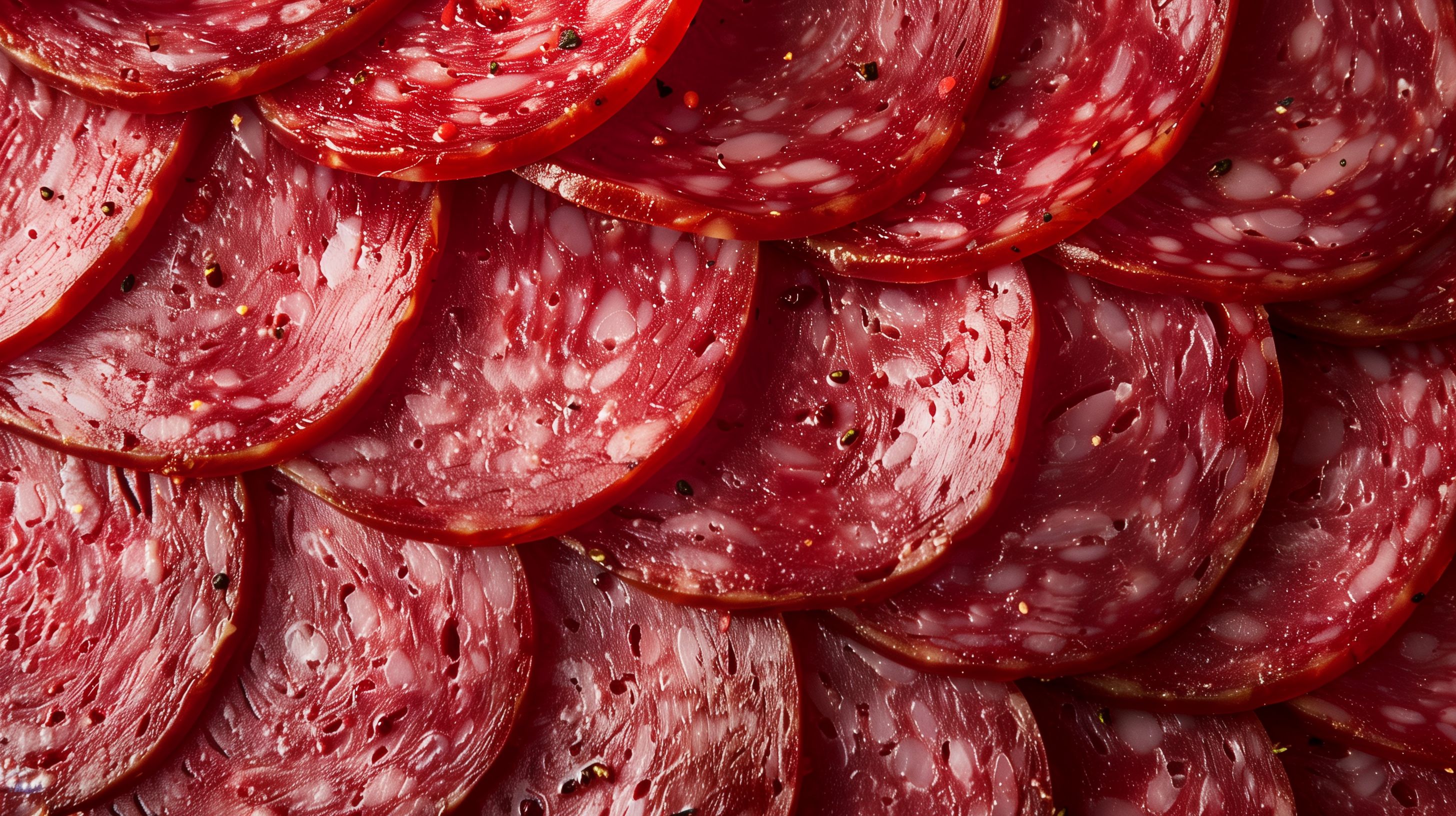 Dieses Foto zeigt eine Nahaufnahme von frisch aufgeschnittener Salami. Die leuchtend roten, glänzenden Scheiben sind von einer feinen Feuchtigkeit überzogen und verleihen dem Bild eine appetitliche, rustikale Anmutung. Die detailreiche Textur und Struktur des Fleischaufschnitts steht im Fokus und lässt den Betrachter förmlich den Geschmack und Geruch der Salami wahrnehmen. Dieses hochauflösende Stockfoto eignet sich hervorragend für die Verwendung in Lebensmittel-Blogbeiträgen, Rezeptsammlungen, Werbematerialien für Feinkostläden oder Social-Media-Posts zum Thema Kulinarik. Das Bild steht unter der Creative-Commons-Lizenz zur kostenlosen kommerziellen Nutzung zur Verfügung.