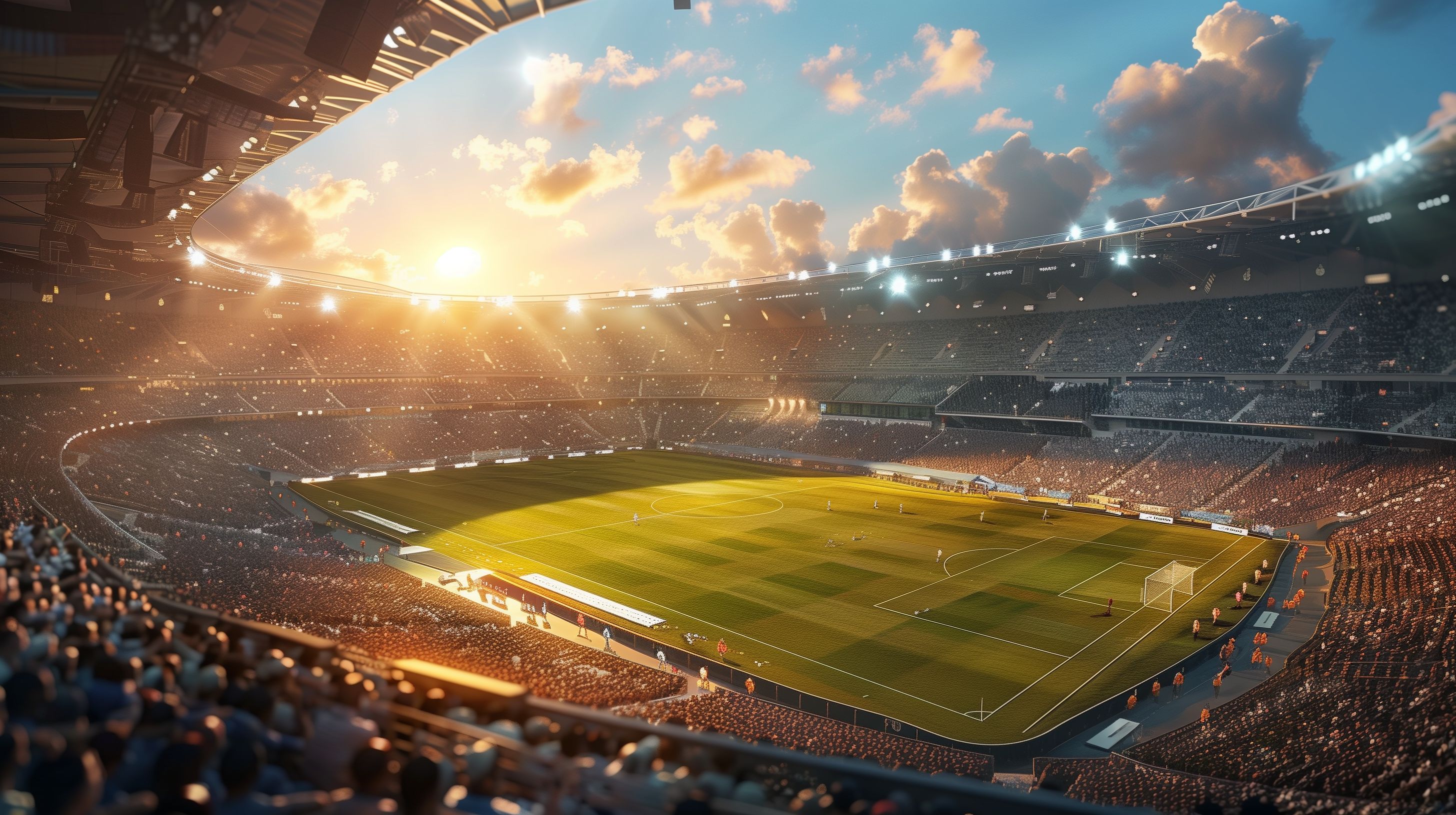 Das Bild zeigt ein überbuchtes Fußballstadion kurz vor Sonnenuntergang. Die strahlende Abendsonne taucht den Rasen in ein warmes, gelbes Licht und wirft lange Schatten auf das Spielfeld. Tausende von Zuschauern sitzen auf den Rängen und verfolgen das Geschehen auf dem Platz, wo zwei Mannschaften gegeneinander antreten. Die Stimmung ist elektrisierend, wie es für ein solch wichtiges Fußballspiel typisch ist. Dieses hochauflösende Stockfoto eignet sich hervorragend für Blogbeiträge, Newsle tte r-Designs, Social-Media-Kanäle oder Werbekampagnen rund um den Fußballsport. Es ist unter der Creative-Commons-Lizenz frei verwendbar.