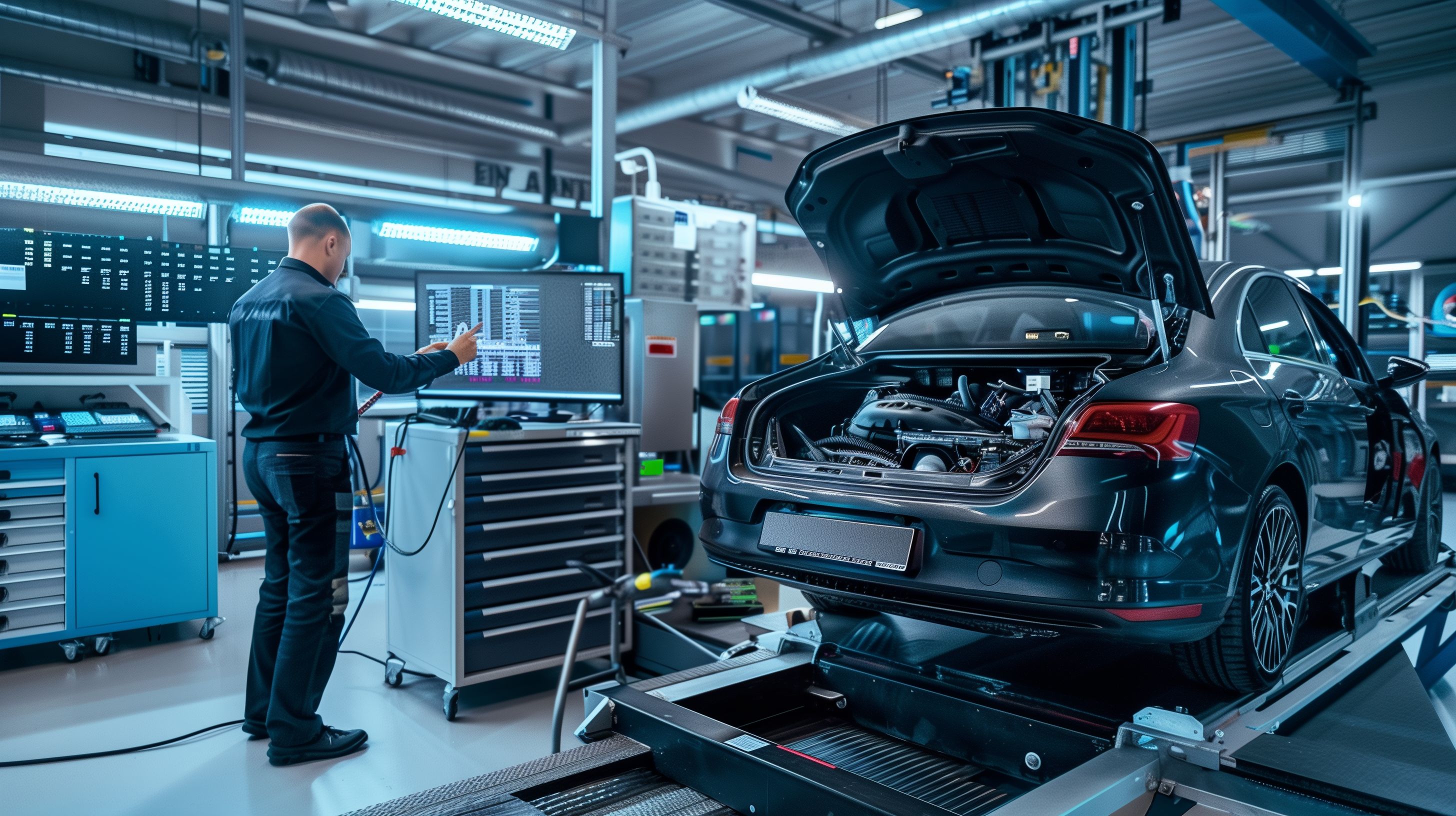 Das Bild zeigt einen Techniker, der ein Auto in einer modernen Autowerkstatt inspiziert. Der Blick fällt auf den geöffneten Kofferraum des Fahrzeugs, in dem verschiedene Komponenten sichtbar sind. Der Arbeiter steht vor einem Computerterminal und scheint die Fahrzeugdiagnostik durchzuführen. Die Werkstatt ist hochmodern eingerichtet mit Regalen voller Werkzeuge und Ersatzteile. Die Beleuchtung ist kühl und technisch. Dieses Bild ist ideal für Beiträge rund um Automobiltechnik, Kfz-Reparatur und -Wartung sowie für Werbematerialien im Bereich der Kfz-Branche geeignet. Es ist ein hochwertiges, kostenloses Stockfoto unter Creative-Commons-Lizenz.
