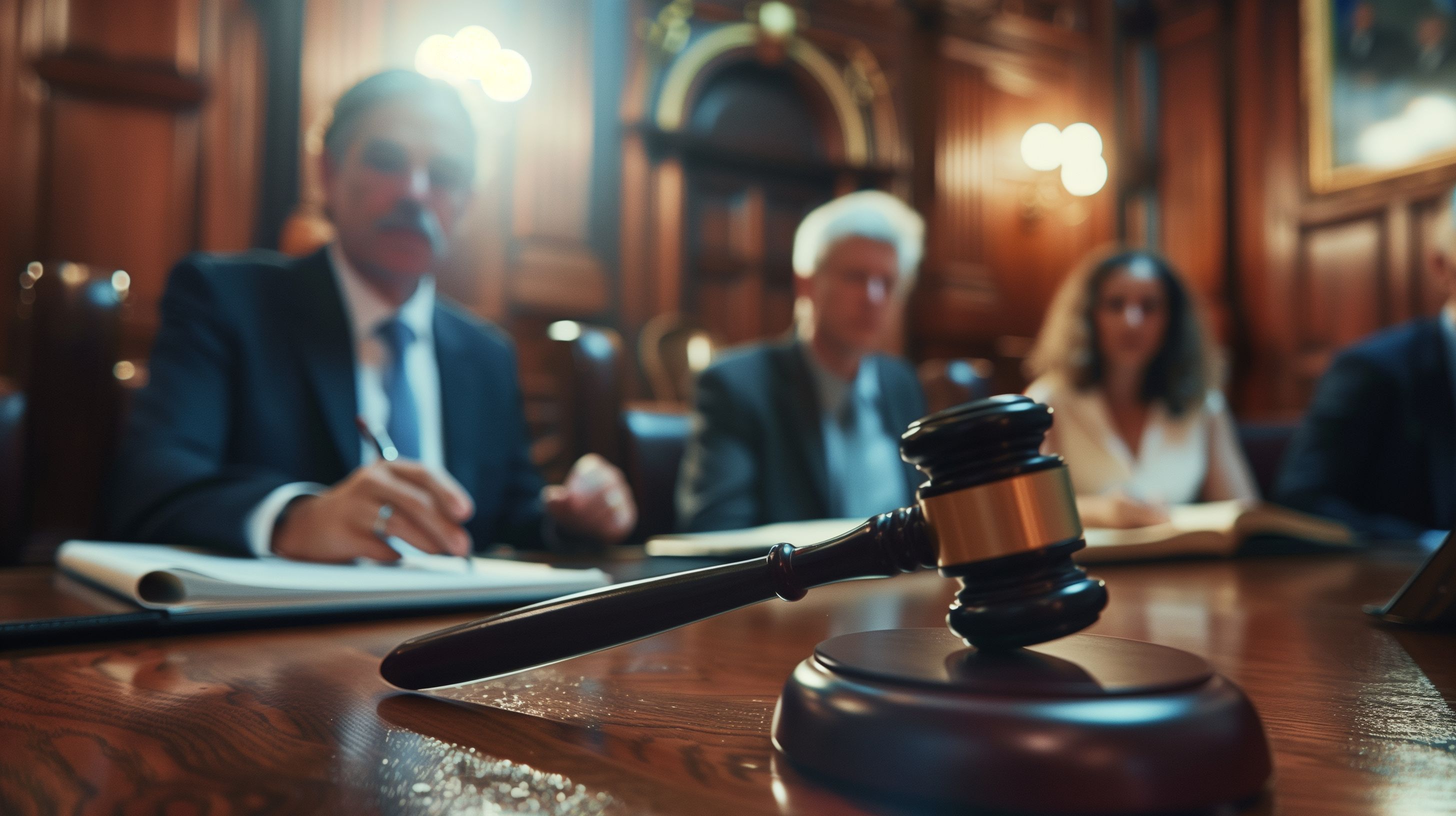 Das Bild zeigt einen klassischen Gerichtssaal mit schweren Holzmöbeln und einer feierlichen, traditionellen Atmosphäre. Im Vordergrund befindet sich der Richterhammer, ein Symbol der Autorität und Entscheidung. Im Hintergrund sind zwei Anwälte und eine Person zu sehen, die vermutlich der Richter ist. Das Foto vermittelt den Eindruck eines formellen, respekteinflößenden Rechtssystems, in dem wichtige Entscheidungen getroffen werden. Dieses Stockfoto eignet sich hervorragend für Blogbeiträge, Newsletter oder Werbematerialien rund um Themen wie Recht, Justiz, Gerichtsprozesse und das Rechtssystem. Es ist in hoher Auflösung verfügbar und kann unter einer Creative-Commons-Lizenz kostenfrei genutzt werden.