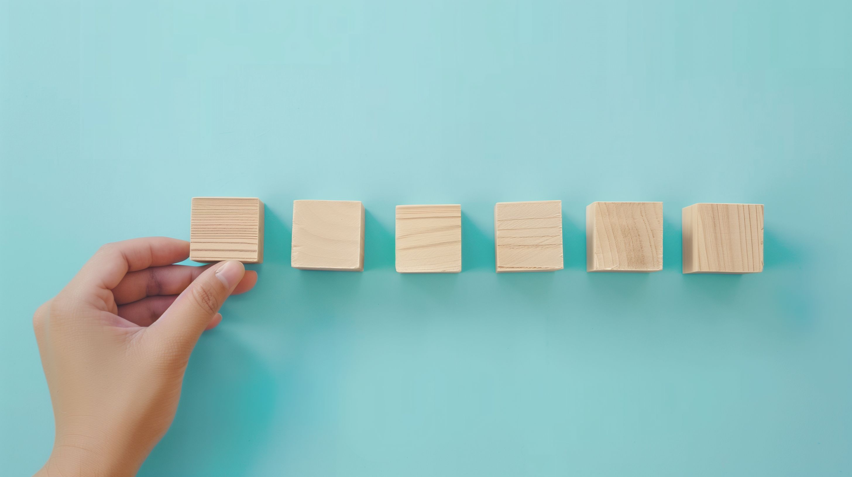 Dieses Foto zeigt eine Reihe von einfachen Holzwürfeln auf einem pastellfarbenen Hintergrund. Eine menschliche Hand ist dabei, einen der Würfel zu berühren oder zu bewegen. Das Bild vermittelt ein Konzept von Planung, Organisation und Entscheidungsfindung, indem es die Anordnung der Würfel in den Mittelpunkt stellt.