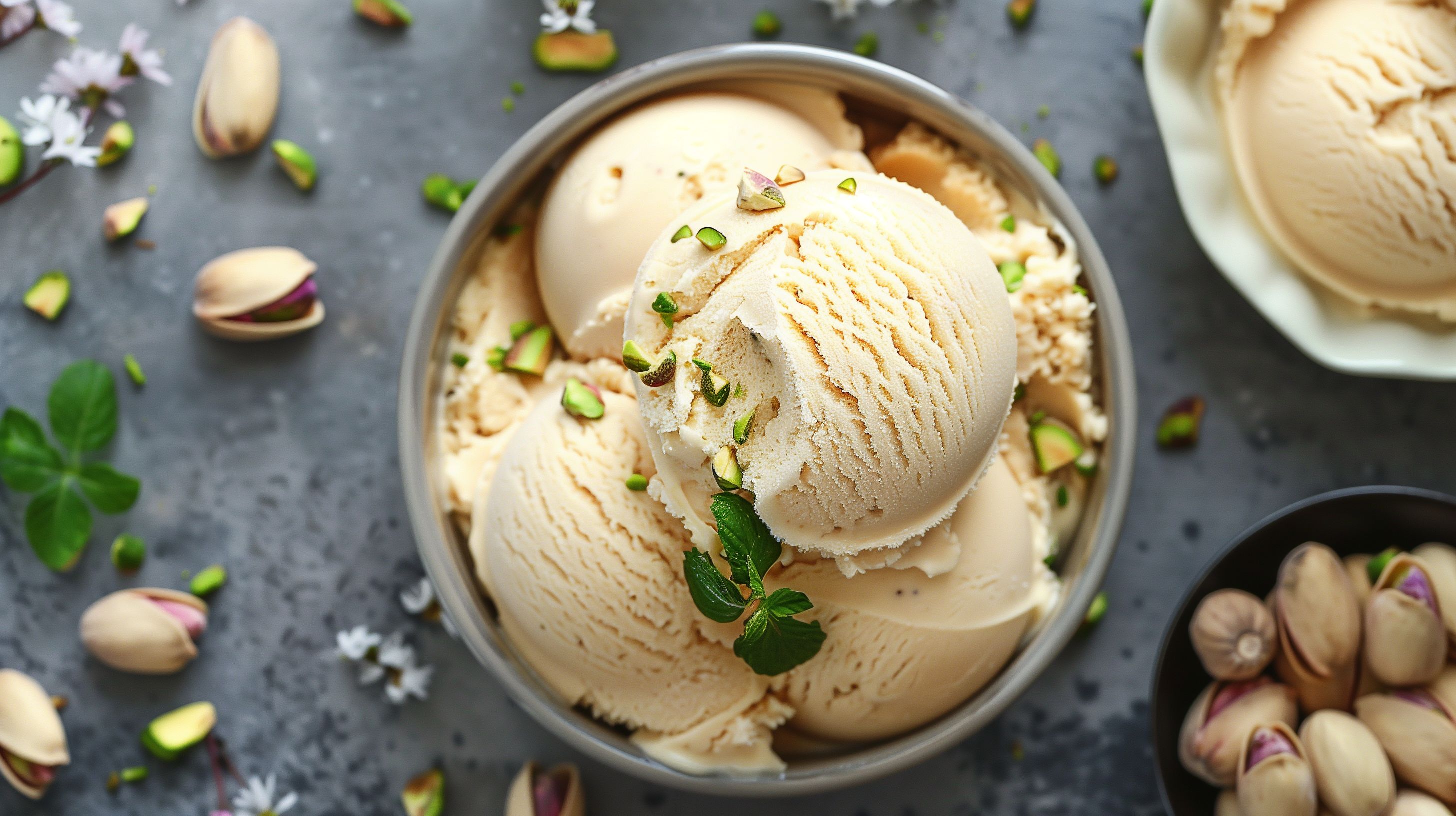 Dieses appetitliche Foto zeigt einen Eisbecher mit leckerer Pistazieneis-Kugel. Das Eis ist mit frischen Minzblättern garniert und von gerösteten Pistazien umgeben, die dem Gericht eine köstliche Textur verleihen. Die Perspektive von oben betont die sorgfältige Anrichtung und die schönen, grünen Farbtöne. Dieses Bild eignet sich perfekt für Rezeptbeiträge, Foodblogposts oder Werbung für Eisdielen und Cafés. Als hochwertiges, kostenloses Stockfoto in kreativer Creative-Commons-Lizenz bietet es eine vielseitige Nutzungsmöglichkeit für deine digitalen Kanäle.
