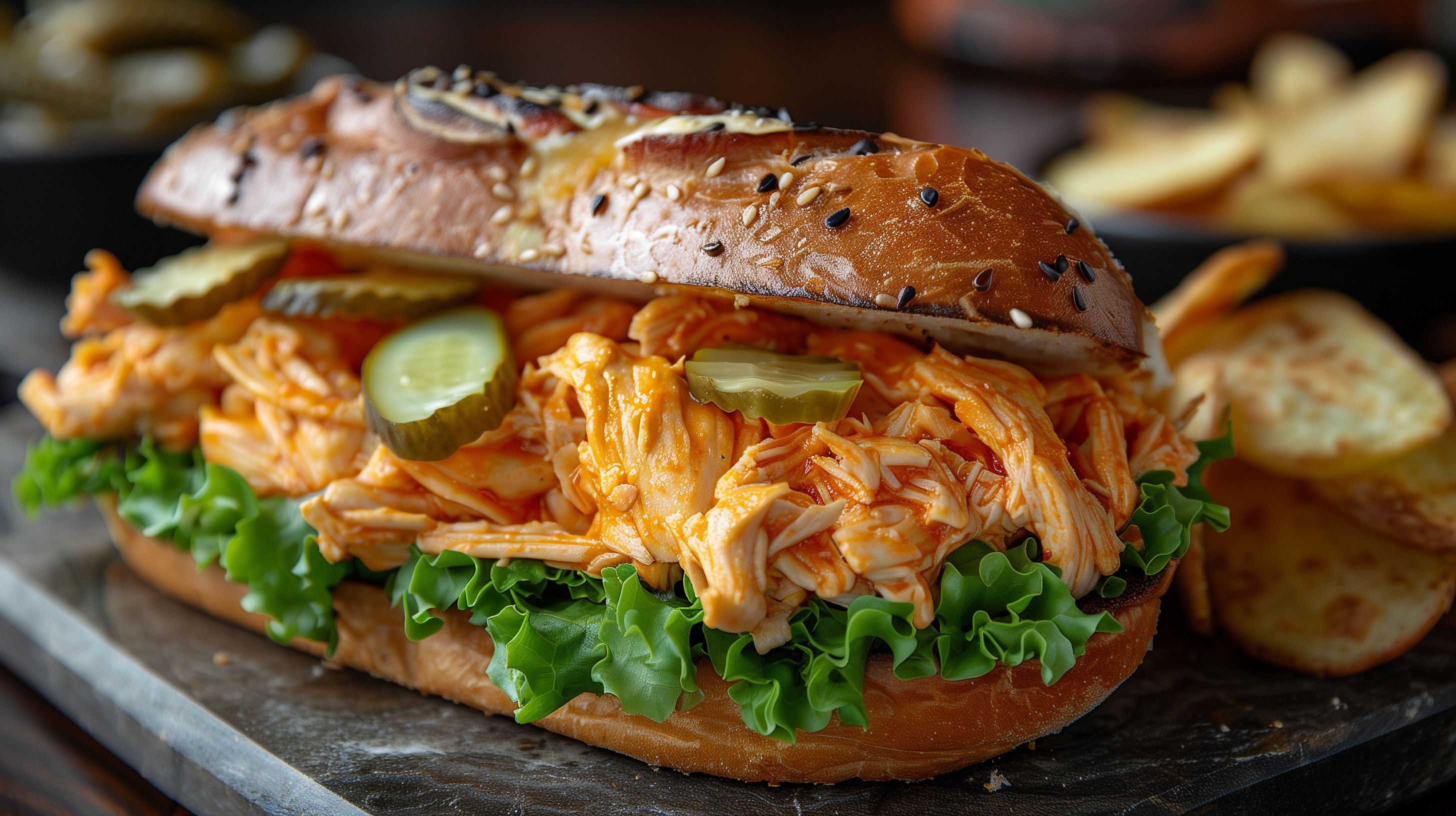 Das Foto zeigt ein schmackhaftes Buffalo-Hähnchen-Sandwich auf einem dunklen Holzbrett. Das Brötchen ist mit sesambeschichtet und oben mit knusprigen, dunkelbraunen Krümeln bestreut. Es ist mit einem saftigen, gezupften Buffalo-Hähnchen-Ragout gefüllt, das von knackigem Krautsalat und kräftigen Gewürzgurken umgeben ist. Die grünen Salatblätter sorgen für einen frischen Kontrast. Insgesamt ergibt sich ein appetitliches, rustikales Bild, das Lust auf einen leckeren Snack oder ein sättigendes Mittagessen macht. Dieses hochwertige Stockfoto ist in hoher Auflösung und unter einer Creative-Commons-Lizenz verfügbar.