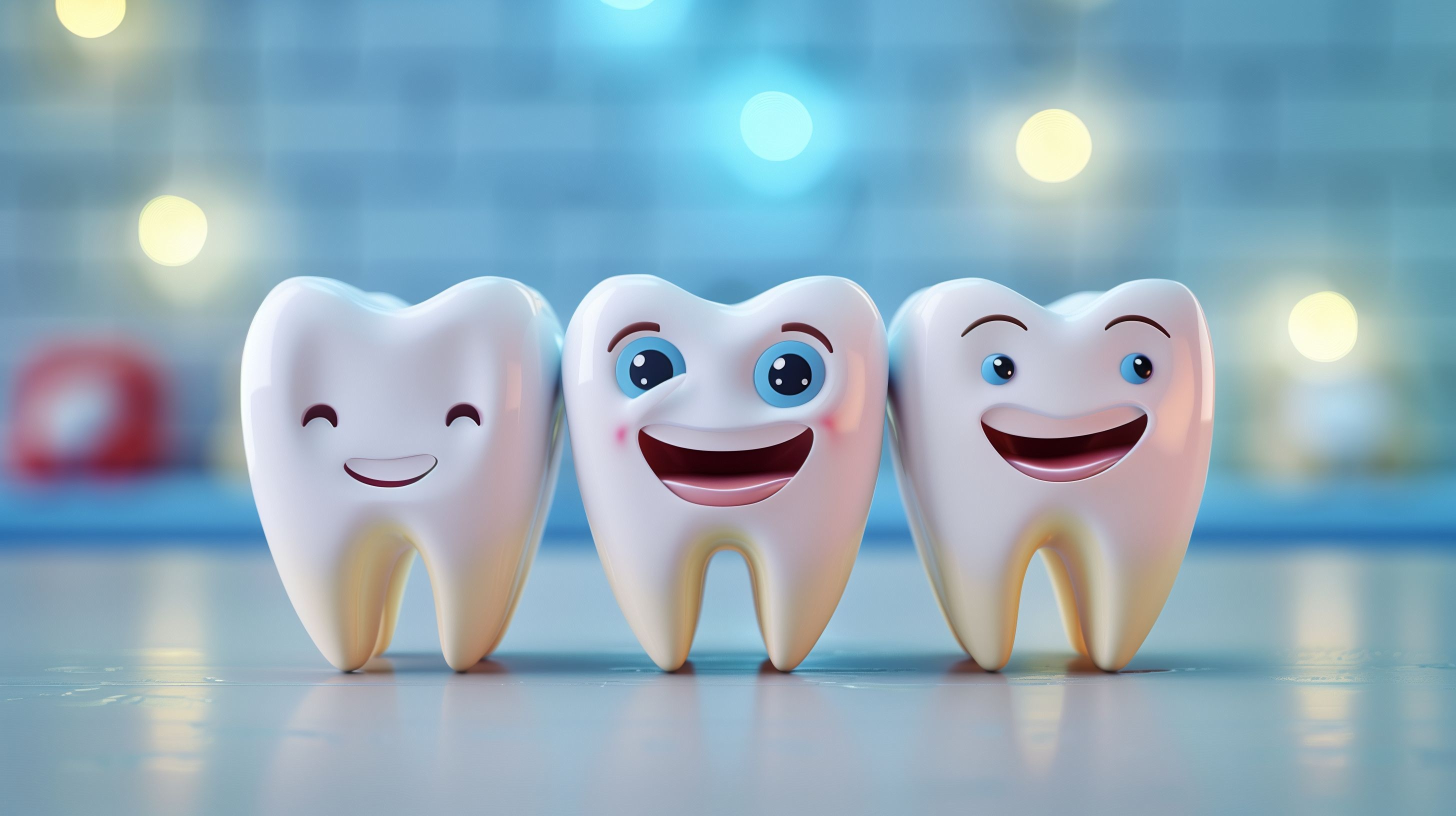 Dieses fröhliche Cartoon-Bild zeigt drei lächelnde, weiße Zähne vor einem blauen Hintergrund mit unscharfen, leuchtenden Lichtern. Die Zähne stehen symbolisch für Mundpflege, Zahnhygiene und den Schutz der Zahngesundheit. Das Bild eignet sich perfekt für Blogs, Newsletter, Social-Media-Beiträge und Werbekampagnen rund um Themen wie Dental-Medizin, Prävention und Behandlung von Zahnproblemen. Dieses hochauflösende Stockfoto ist unter einer Creative-Commons-Lizenz kostenlos nutzbar.