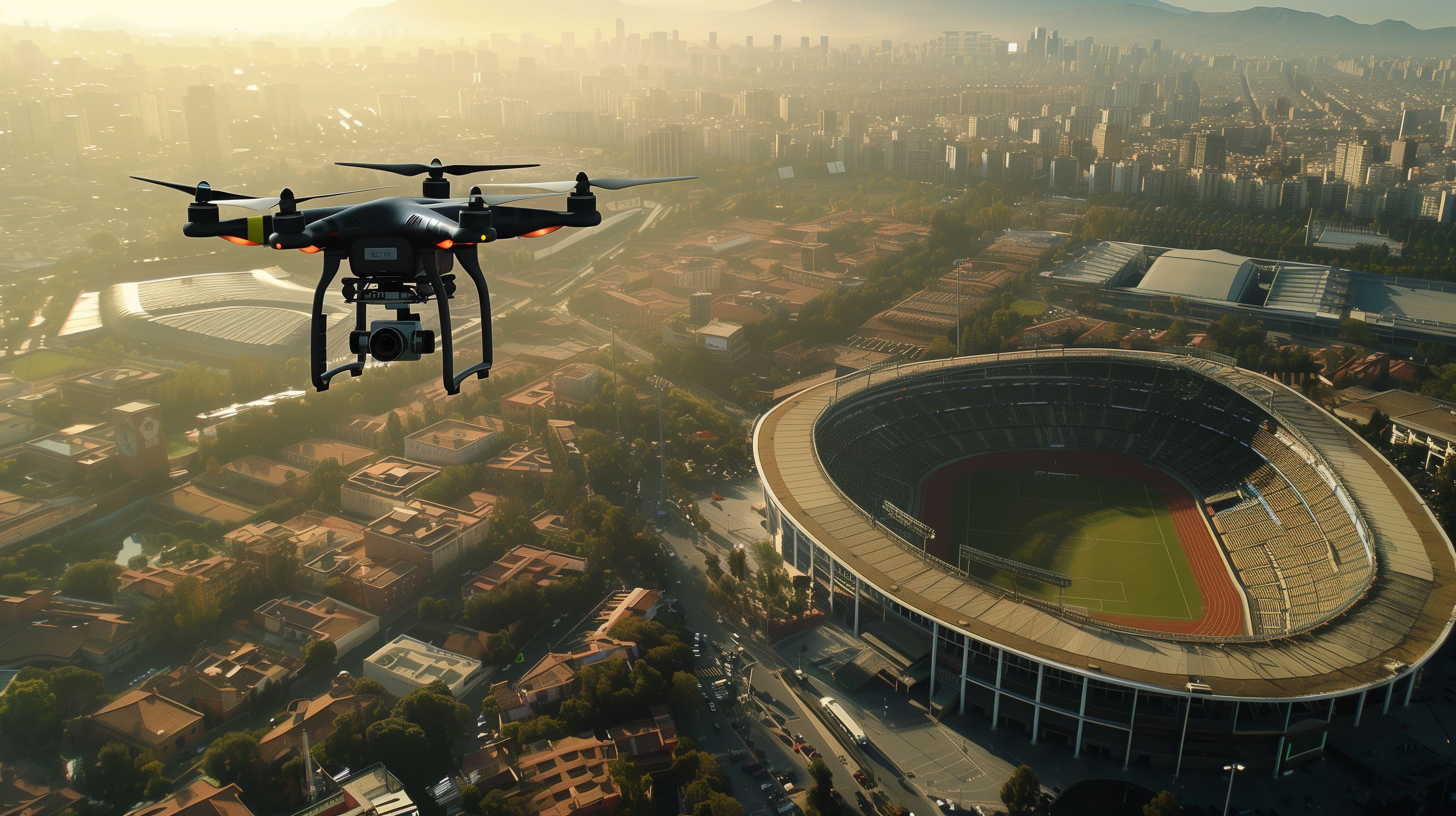 Dieses beeindruckende Foto zeigt eine Drohnenaufnahme über einer modernen Großstadt. Im Vordergrund ist ein riesiges Stadion zu sehen, umgeben von Wolkenkratzern und Hochhäusern. Die Perspektive aus der Luft verleiht dem Bild eine futuristische Note und lässt die Stadt wie eine lebendige, technologisch fortschrittliche Metropole erscheinen. Die warmen Farben des Sonnenuntergangs tauchen alles in ein stimmungsvolles Licht. Dieses faszinierende Luftbild eignet sich hervorragend für Blog-Beiträge, Newsletter-Designs oder Werbematerialien, die einen modernen, dynamischen Look vermitteln möchten. Als kostenloses Stockfoto in hoher Auflösung unter einer Creative-Commons-Lizenz kann es vielseitig eingesetzt werden.