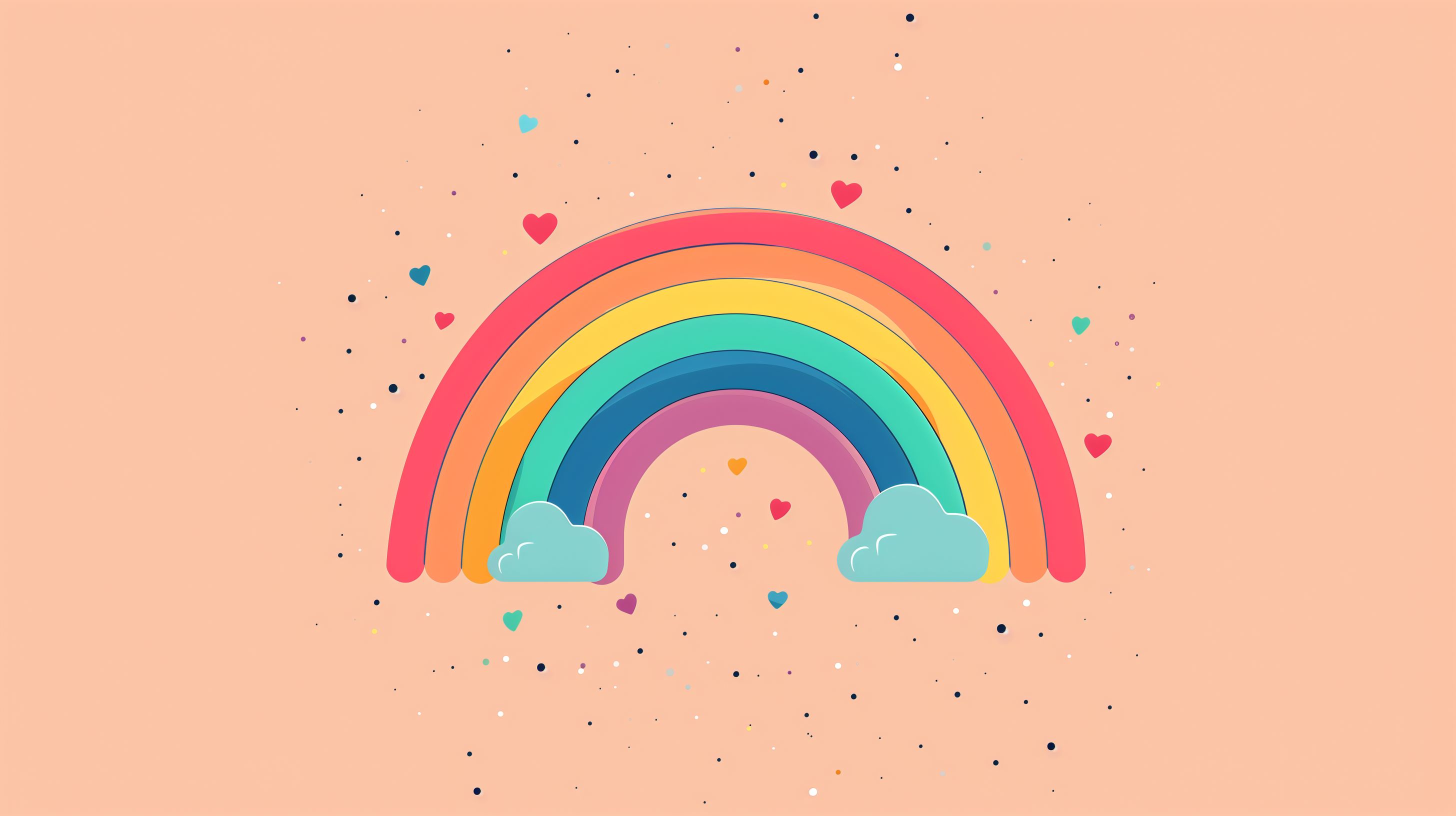 Diese fröhliche und farbenfrohe Illustration zeigt einen bunten Regenbogen mit Herzen und Sternen vor einem apricotfarbenen Hintergrund. Der Regenbogen erstreckt sich über den gesamten Bildausschnitt und ist in leuchtenden Farben wie Rot, Orange, Gelb, Grün, Blau und Lila gestaltet. Kleine Herzen und Sterne sind rund um den Regenbogen verstreut und verleihen dem Bild eine spielerische, freudige Stimmung. Diese detailreiche Vektorillustration eignet sich hervorragend als kostenloses Stockfoto für Blogs, Newsletter, Social-Media-Postings oder Werbematerialien in hoher Auflösung und unter Creative-Commons-Lizenz.