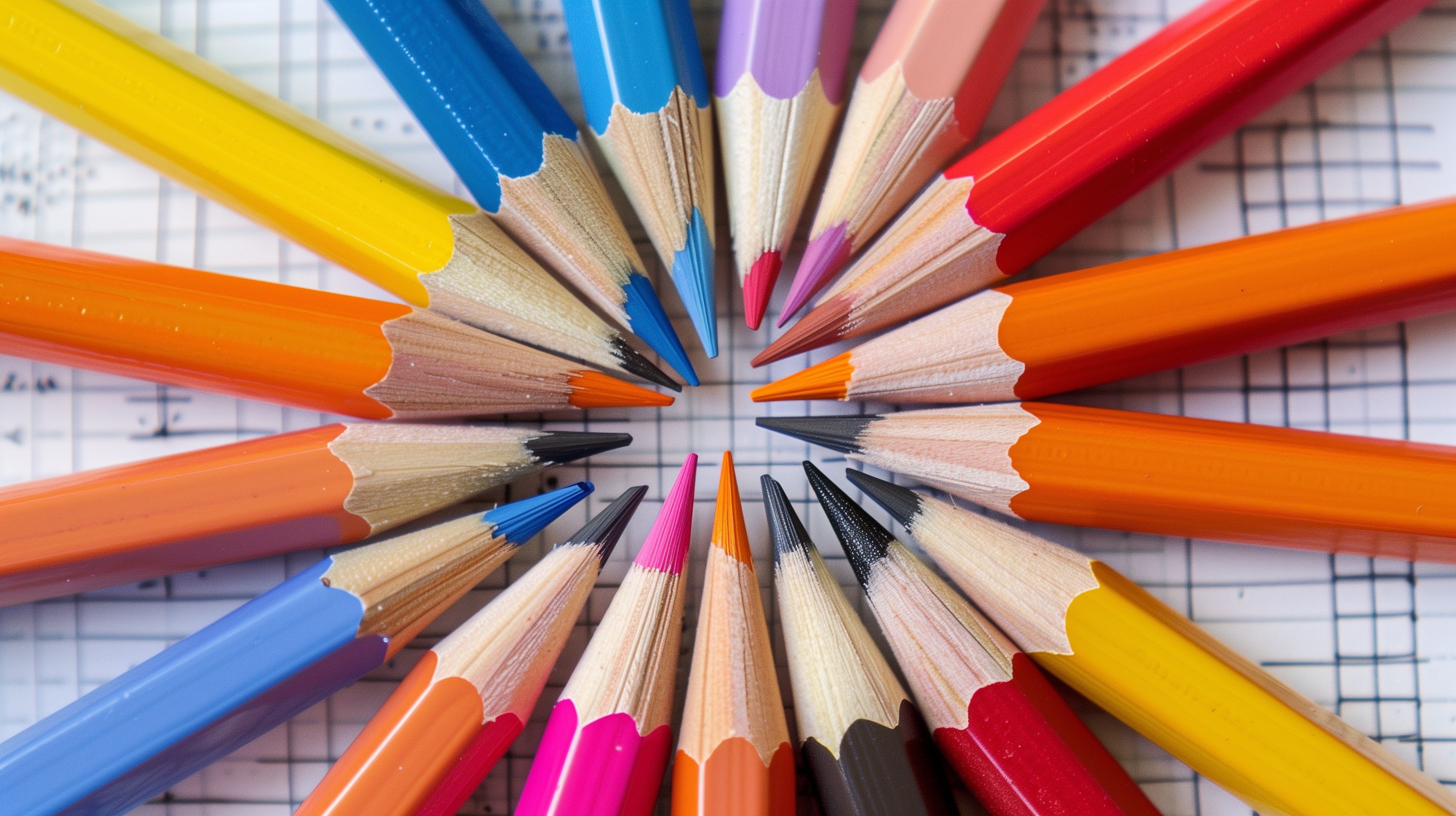 Dieses Foto zeigt eine symmetrische Anordnung bunter Buntstifte auf kariertem Papier. Die Stifte sind in einem kreisförmigen Muster angeordnet, was einen präzisen und gleichmäßigen Eindruck vermittelt. Die Farbpalette reicht von Pastelltönen wie Blau, Rosa und Lavendel bis hin zu kräftigen Farben wie Rot, Orange und Gelb. Dieses Bild eignet sich hervorragend als Hintergrund oder Grafikelement für kreative Projekte, Blogbeiträge, Social-Media-Posts oder Werbekampagnen rund um Themen wie Schule, Bildung, Kunst, Kreativität und Büroausstattung. Das hochauflösende Foto steht unter einer kostenlosen Creative-Commons-Lizenz zur Verfügung und kann frei genutzt werden.