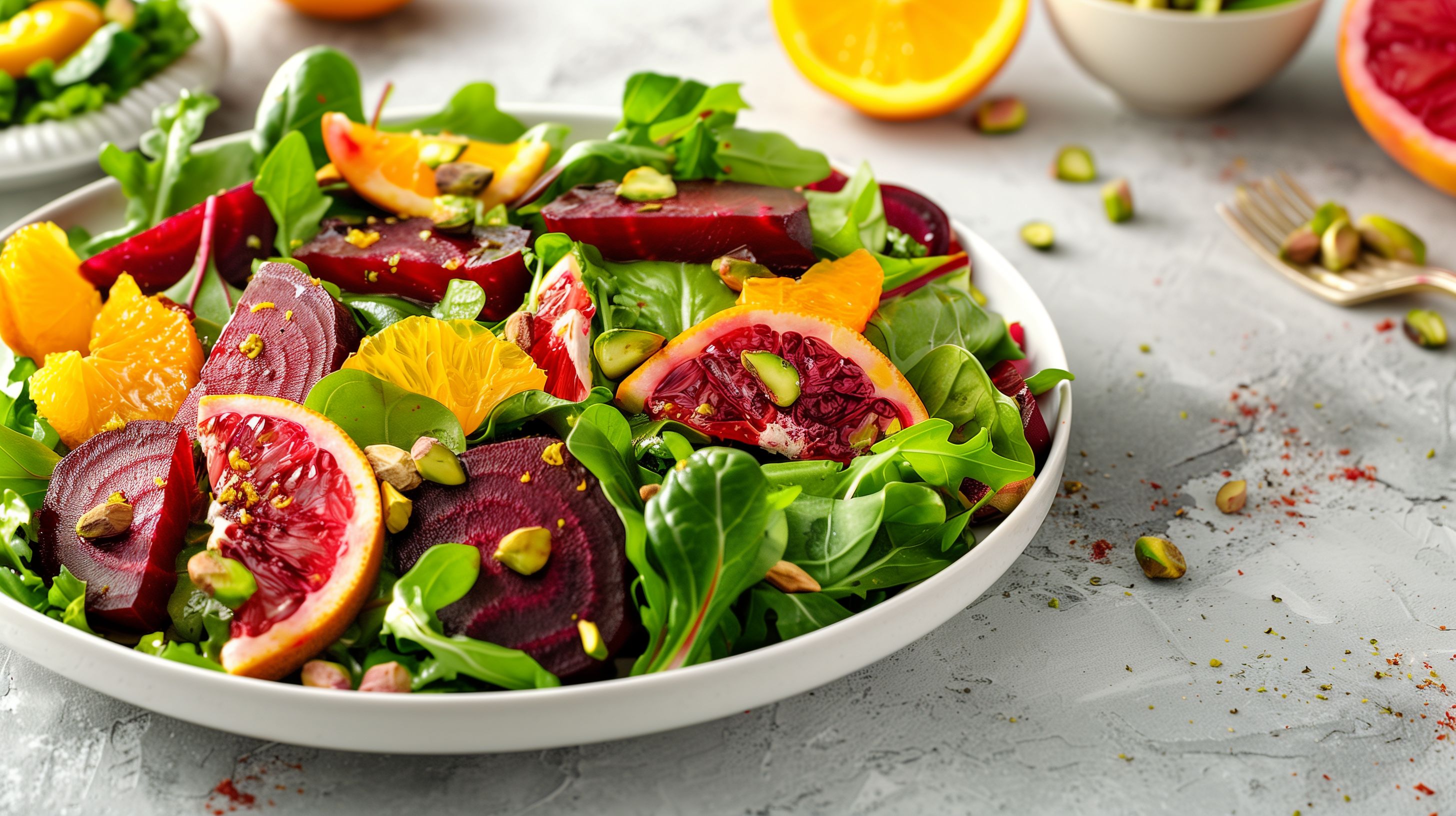 Dieses Foto zeigt einen frischen und gesunden Rote-Bete- und Orangensalat mit knackigem Rucola, dekoriert mit Orangenscheiben, Pistazien und anderen Zutaten. Das Bild besticht durch seine kräftigen, natürlichen Farben und die appetitliche, rustikale Präsentation auf einem Teller vor einem hellen, neutralen Hintergrund. Dieser Salat wäre ideal als Hauptspeise, Beilage oder leichte Mahlzeit für ein gesundes Mittagessen oder Abendessen. Das hochauflösende Foto ist kostenfrei als Stockfoto unter Creative-Commons-Lizenz verfügbar und könnte perfekt für Blogs, Social-Media-Kanäle, Newsletter oder Werbematerialien zum Thema gesunde Ernährung eingesetzt werden.