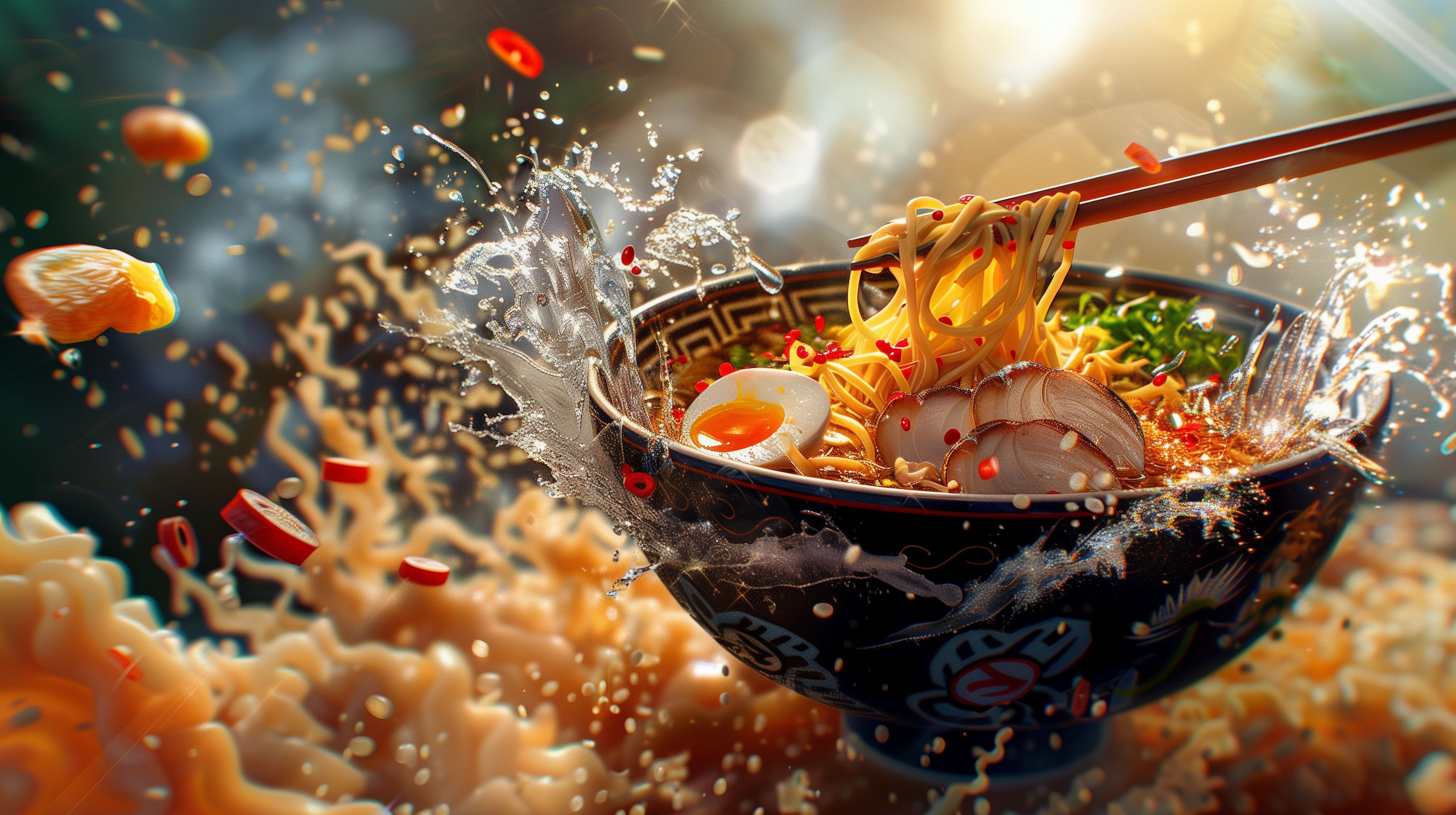 Dieses hochauflösende Stockfoto zeigt eine dampfende Schüssel mit frisch zubereiteter Ramen-Nudelsuppe. Die Suppe ist mit handgeschnittenen Nudeln, gedämpften Eiern, frischem Gemüse und einer würzigen Tonkotsu-Brühe gefüllt. Der Dampf steigt in großen Wellen auf, was dem Gericht eine lebendige und appetitanregende Optik verleiht. Dieses Foto eignet sich hervorragend für Verwendung in Blogs, Newslettern, Social-Media-Kanälen oder Werbematerialien rund um asiatische Küche, Kochen und Kulinarik. Als kostenloses Stockfoto in hoher Auflösung unter einer Creative-Commons-Lizenz kann es frei genutzt werden.