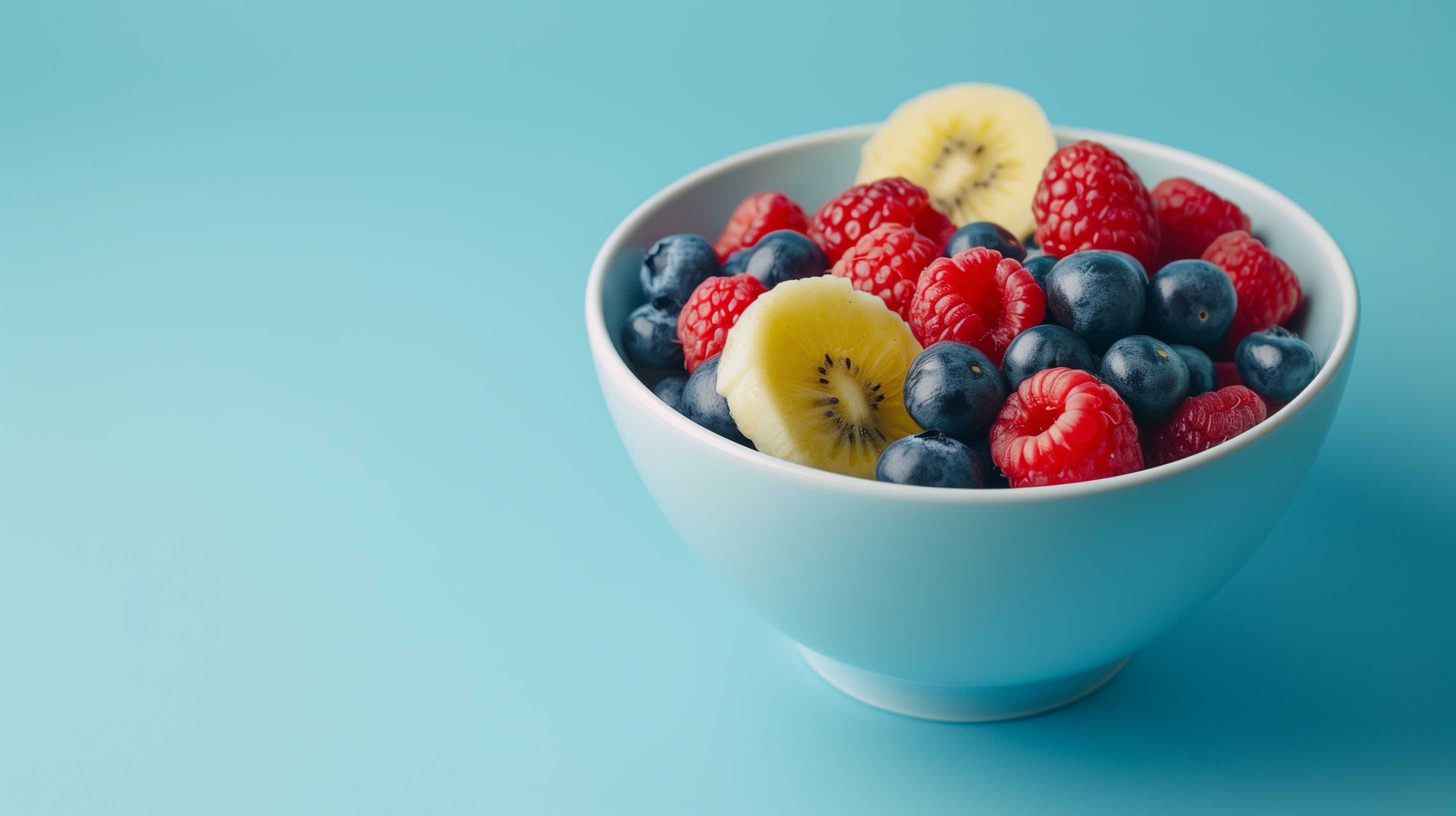 Diese bunte Obstschale präsentiert eine Vielfalt an frischen, saftigen Früchten wie Himbeeren, Blaubeeren und Kiwistücke vor einem klaren blauen Hintergrund. Die Anordnung und Farbkomposition der Früchte in der weißen Schüssel ergibt ein appetitliches, frisches und einladendes Stillleben-Motiv. Dieses hochwertige Stockfoto eignet sich hervorragend als Eyecatcher für Blogbeiträge, Newsletter oder Social-Media-Postings rund um gesunde Ernährung, Rezepte oder Lifestyle-Themen. Das Bild ist in hoher Auflösung verfügbar und steht unter einer kostenlosen Creative-Commons-Lizenz zur Verfügung.