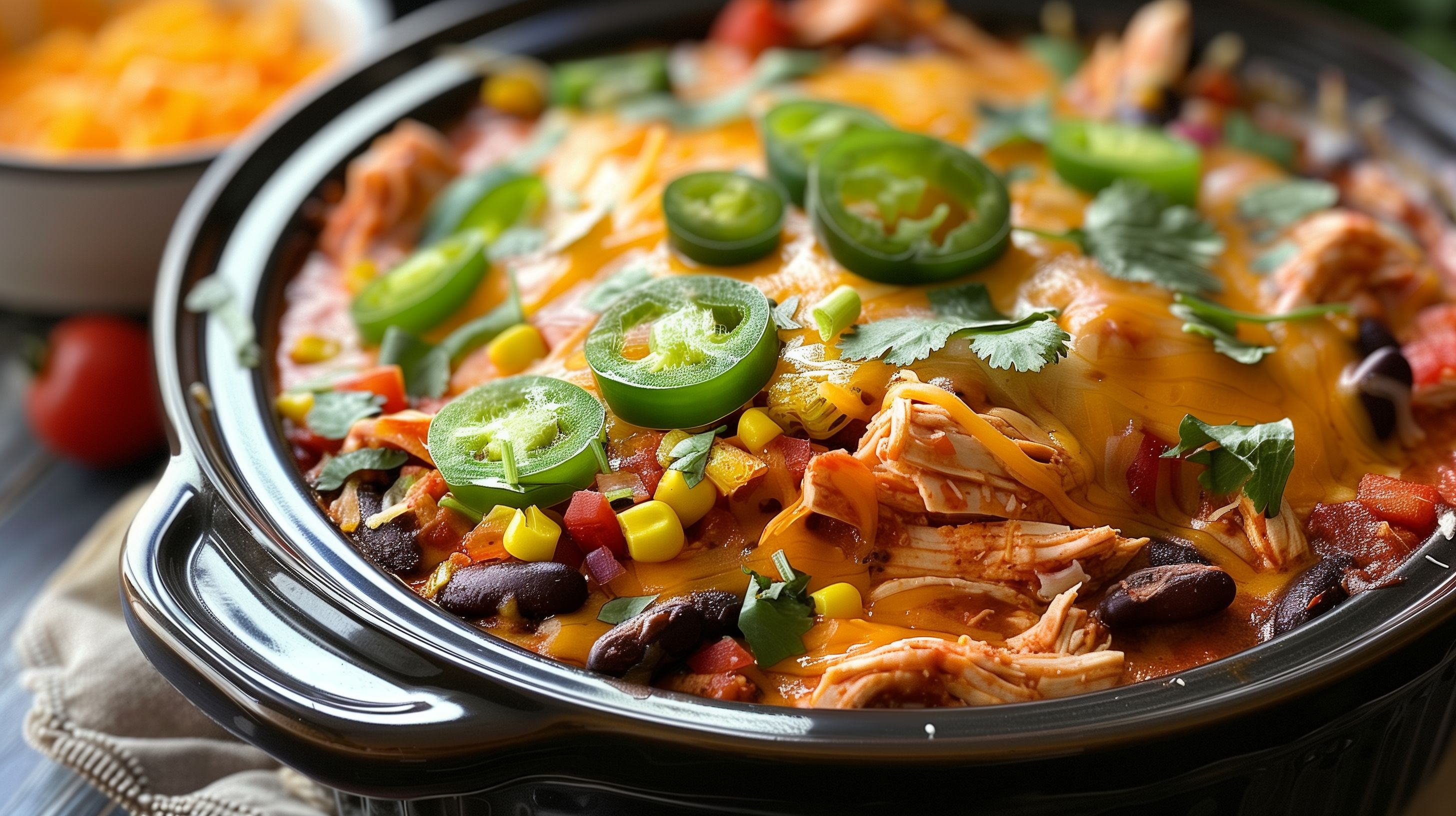 Dieses appetitlich aussehende Foto zeigt ein köstliches mexikanisches Enchilada-Gericht mit Hähnchen, serviert in einer rustikalen Schüssel. Die Schüssel ist gefüllt mit einem bunten Gemisch aus Hähnchenfleisch, Tomatensalsa, Mais, Bohnen, Paprika und frischen Kräutern wie Koriander. Die Scheiben grüner Jalapenos verleihen dem Gericht eine schöne farbliche Akzentierung. Das Foto vermittelt ein appetitliches, einladendes Gesamtbild eines traditionellen Tex-Mex-Essens, ideal als kostenloses Stockfoto für Rezepte, Foodblogs, Werbung oder Social-Media-Beiträge in hoher Auflösung und unter Creative-Commons-Lizenz.