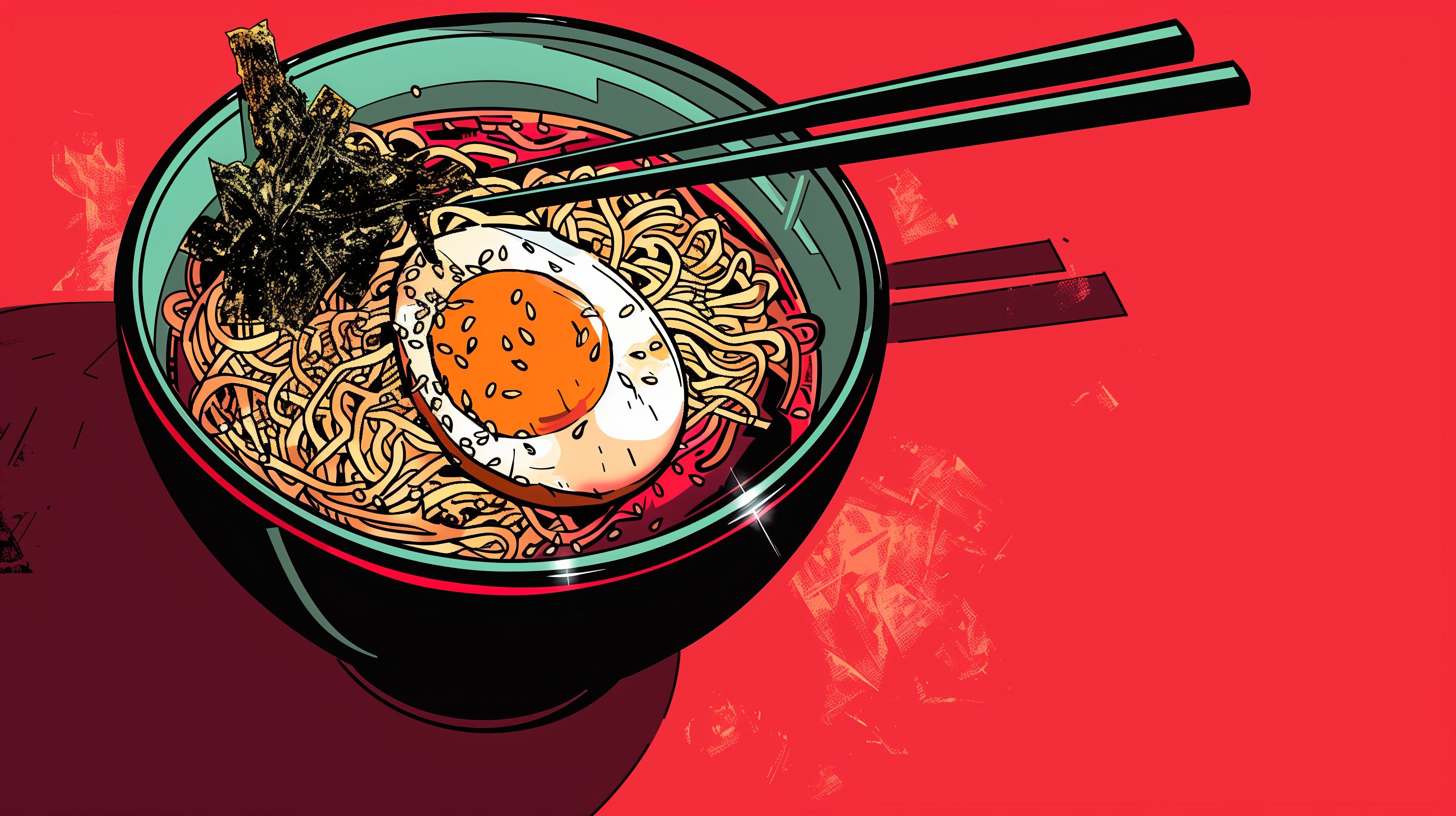 Diese farbenfrohe, stilisierte Illustration zeigt ein leckeres asiatisches Nudelgericht in einer Schüssel. Die Nudeln sind mit einem Ei, Gewürzen und Gemüse dekoriert und werden von Essstäbchen flankiert. Der Kontrast zwischen dem kräftigen Rot des Hintergrunds und den schwarzen Konturen der Illustration verleiht dem Bild einen modernen, pop-artigen Charakter. Das Motiv eignet sich hervorragend als Hintergrundbild oder Grafikelement für Blogs, Websites, Newsletter oder Werbematerialien zum Thema asiatische Küche, Ernährung oder kulinarische Kunst. Das hochauflösende Foto steht unter der Creative-Commons-Lizenz zur kostenlosen Nutzung zur Verfügung.
