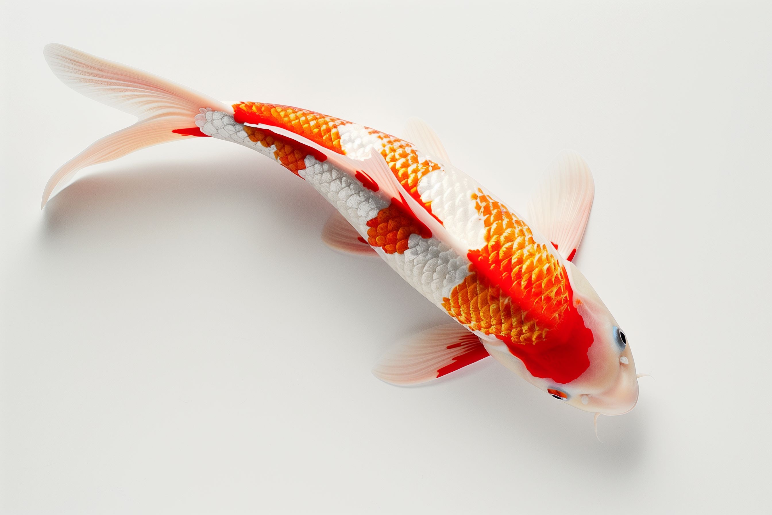 Das Bild zeigt einen wunderschönen Koi-Karpfen in leuchtenden Farben. Der Fisch ist seitlich aufgenommen und nimmt den Großteil des Bildes ein. Seine Flossen sind elegant ausgebreitet, die Schuppen schimmern in einem intensiven Orange, Rot und Weiß. Der Fisch scheint in einem klaren Wasser zu schwimmen, der Hintergrund ist fast vollständig weiß, wodurch der Koi-Karpfen als Hauptmotiv optimal in Szene gesetzt wird.
