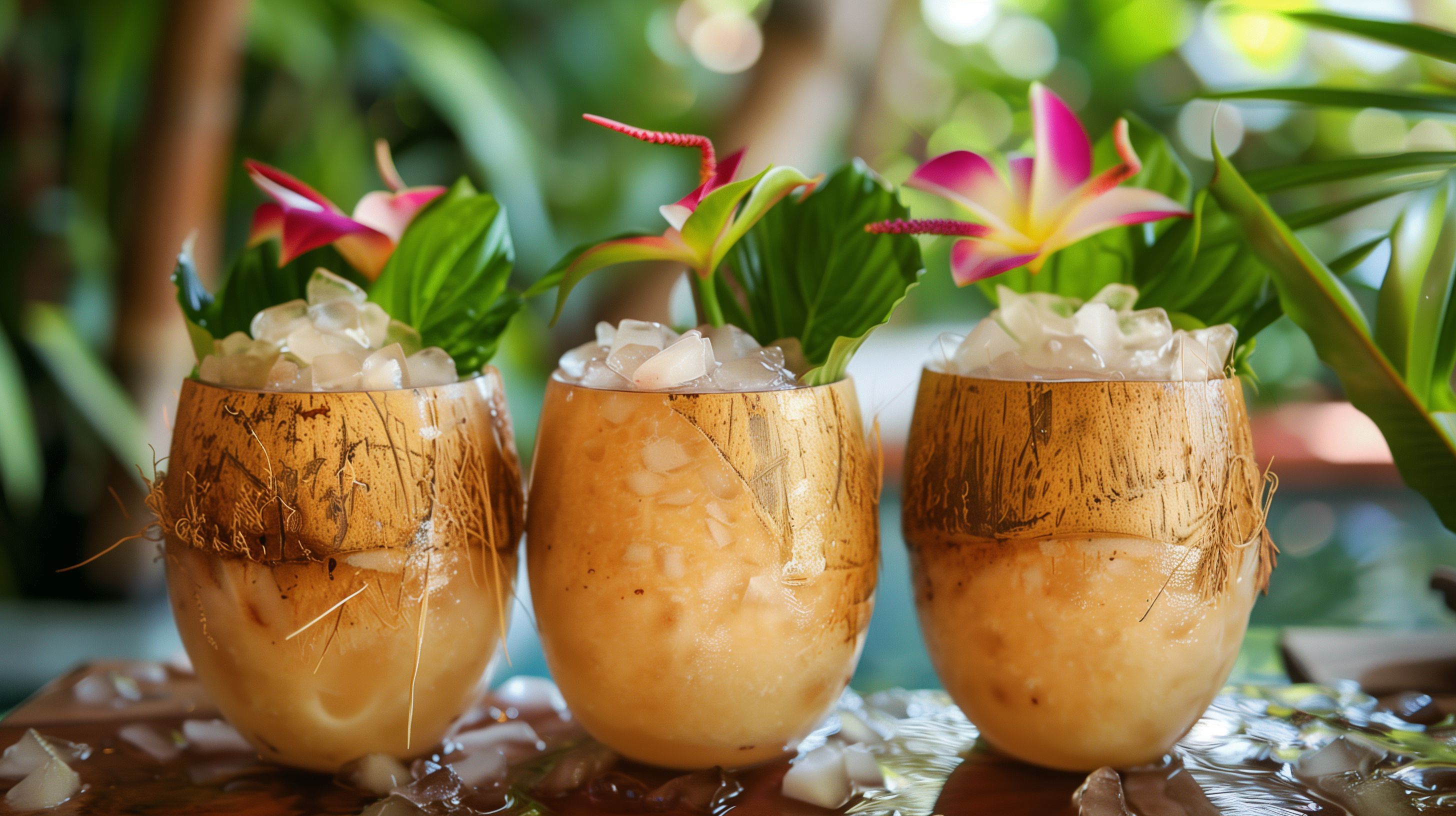 Dieses Foto zeigt drei leckere Kokosnusscocktails, die in typischen tropischen Kokosnussschalen serviert werden. Die Getränke sind mit frischen Eiswürfeln und dekorativen pinken Plumeria-Blüten garniert, die eine schöne Farbakzente setzen. Der Hintergrund ist eine üppige, grüne Vegetation, die eine tropische Atmosphäre schafft. Dieses Stockfoto eignet sich hervorragend für Reise-, Ferien- oder Sommermarketing, ebenso für Gastronomie-Veröffentlichungen oder die Gestaltung von Menükarten. Das kostenlose Foto in hoher Auflösung steht unter der Creative-Commons-Lizenz zur Verwendung zur Verfügung.