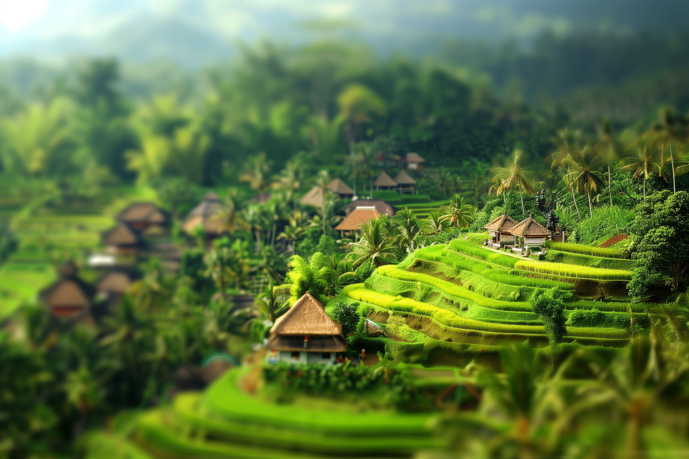 Dieses Foto zeigt eine typische Landschaft der Insel Bali in Indonesien. Es zeigt grüne Reisterrassen, die sich über das Gelände erstrecken, umgeben von traditionellen Hütten mit Strohdächern. Die Perspektive ist mit der Tilt-Shift-Technik leicht verschwommen, was dem Bild eine märchenhafte, miniatürhafte Anmutung verleiht. Die Farben sind kräftig und lebendig, mit verschiedenen Grüntönen, die von der üppigen Vegetation dominiert werden. Dieses Foto eignet sich hervorragend als kostenloses Stockfoto für Reise-, Natur- oder Lifestyle-Themen. Es ist in hoher Auflösung verfügbar und unter einer Creative-Commons-Lizenz nutzbar.