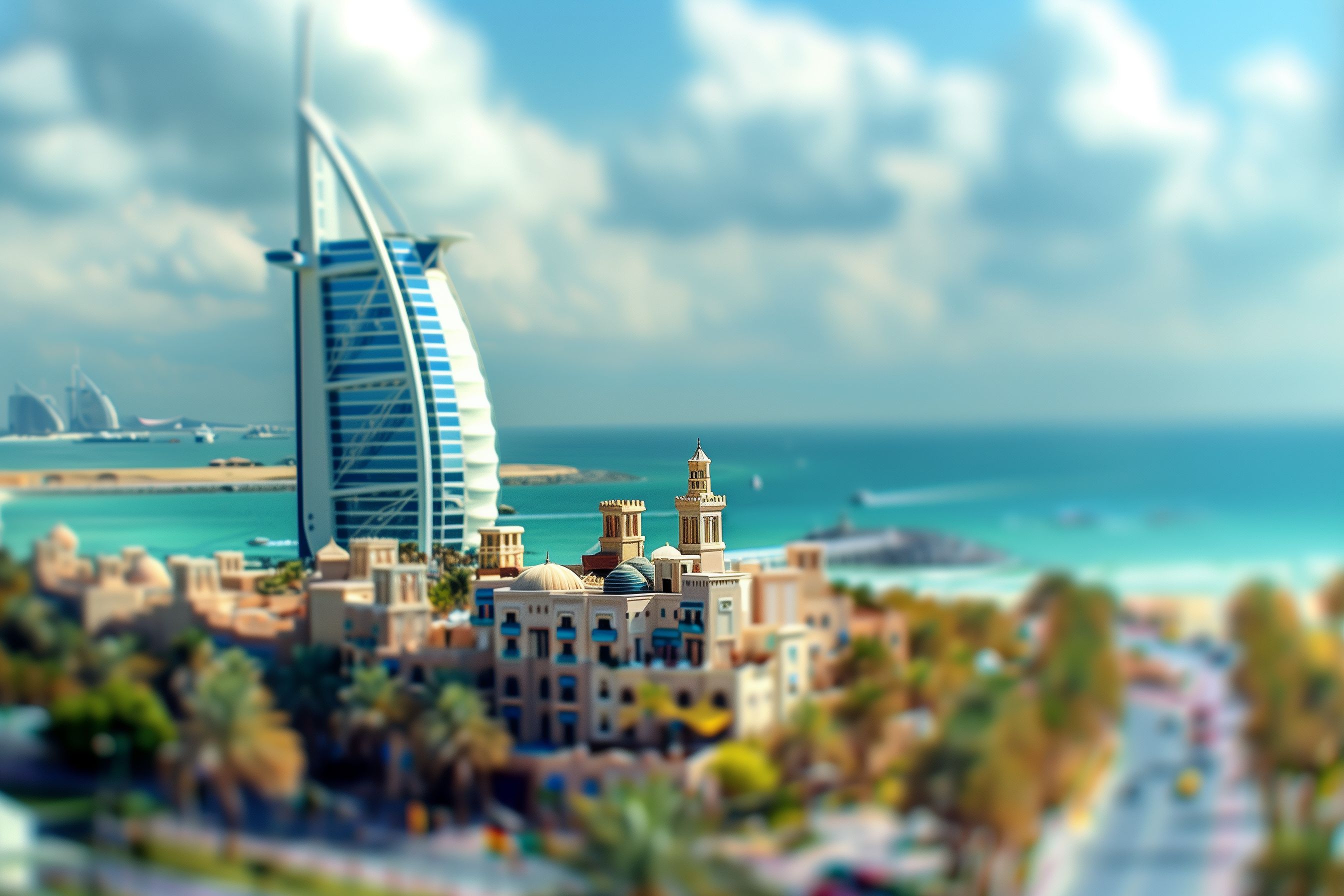 Dieses Stockfoto zeigt eine beeindruckende Skyline der Stadt Dubai in den Vereinigten Arabischen Emiraten. Im Vordergrund ist der ikonische Burj Al Arab-Wolkenkratzer zu sehen, ein Wahrzeichen der Stadt. Die Skyline erstreckt sich über den Horizont, umgeben von strahlend blauem Himmel und Wolken. Die Verwendung einer Tilt-Shift-Linse verleiht dem Bild einen miniaturartigen Charakter, was eine einzigartige Perspektive auf die imposante Architektur der Stadt bietet.