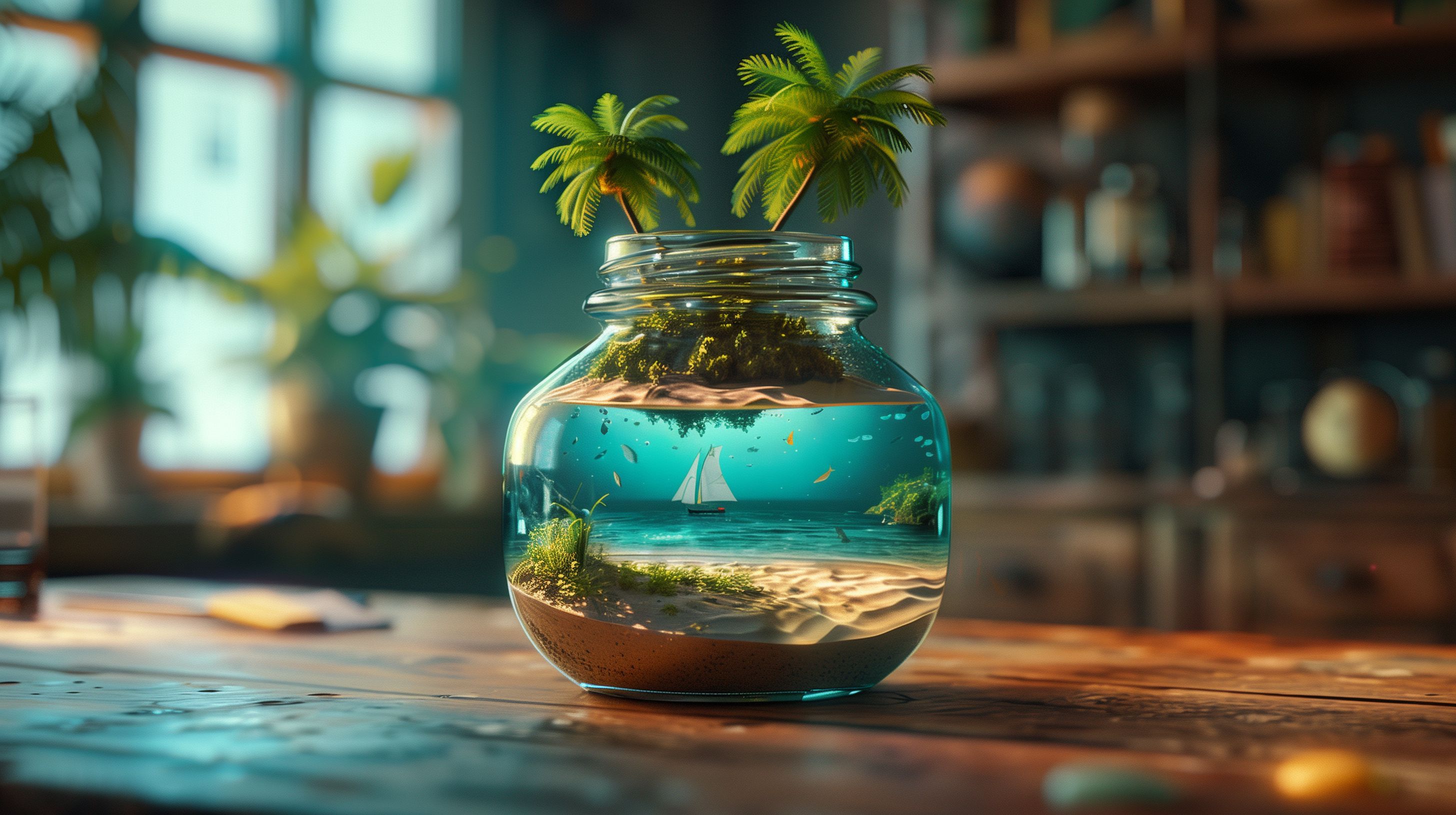 Dieses bezaubernde Foto zeigt eine tropische Urlaubsidylle in einem Glasgefäß. Im Zentrum befindet sich eine Miniaturlandschaft mit Palmen, Strand und Segeln, umgeben von dekorativen Moosteilen. Die türkis-grüne Farbe des Wassers und der goldene Sand vermitteln eine angenehme Urlaubsstimmung. Dieses Stockfoto eignet sich hervorragend als Hintergrund für Blogs, Newsletter oder Social-Media-Beiträge, die eine sommerliche, tropische Atmosphäre transportieren wollen. Es ist in hochauflösender Qualität verfügbar und kann unter der Creative-Commons-Lizenz kostenlos genutzt werden.