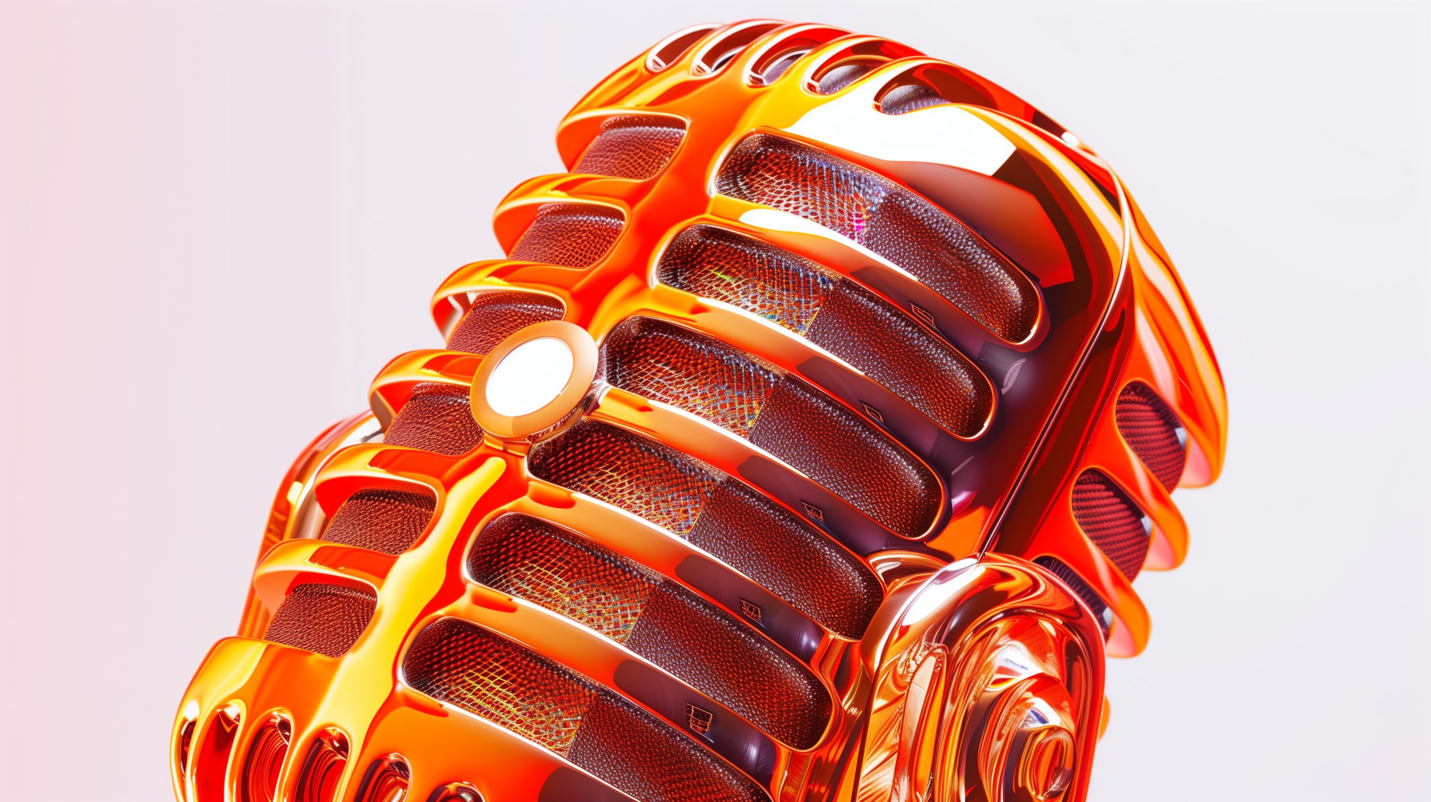 Dieses Foto zeigt eine detaillierte Nahaufnahme eines auffallend orangefarbenen, vintage-inspirierten Mikrofons. Die komplexe, strukturierte Oberfläche des Mikrofons mit ihren organischen Formen und glänzenden Kanten sorgt für einen einzigartigen, fast skulpturalen Eindruck. Die kräftige Farbgebung in Rot- und Orangetönen verleiht dem Objekt einen modernen, technischen Look, der perfekt für die Verwendung in Medien-, Werbe- oder Präsentationskonzepten geeignet ist.