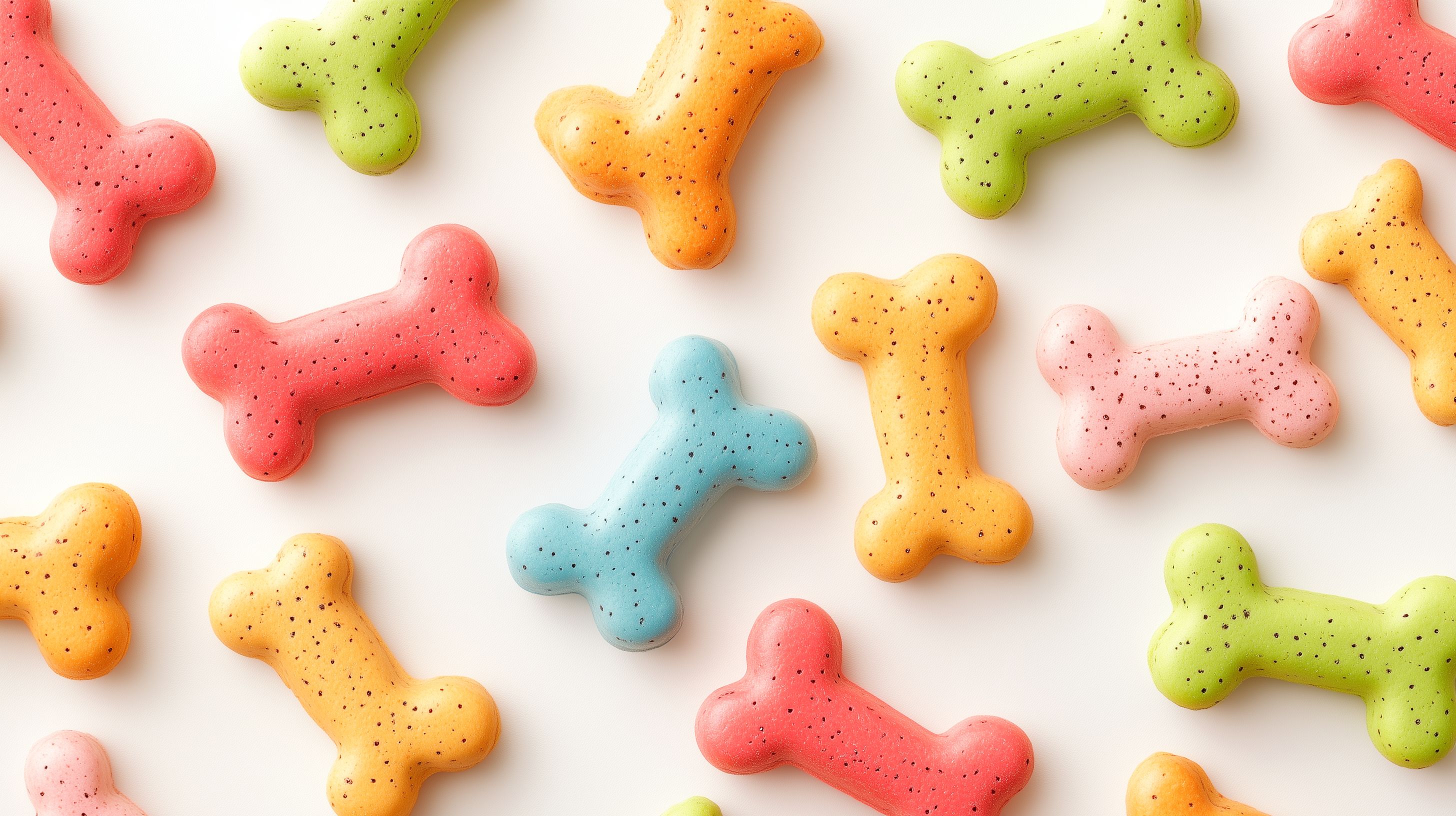 Dieses bunte Bild zeigt eine Anordnung verschiedener, appetitlich aussehender Hundeleckerchen in verschiedenen Formen und Farbtönen. Die einzelnen Knochen-förmigen Snacks sind in Rosa, Orange, Gelb und Grün gehalten und mit dunklen Punkten oder Sprenkeln verziert, was ihnen eine natürliche, geschmackvolle Optik verleiht.