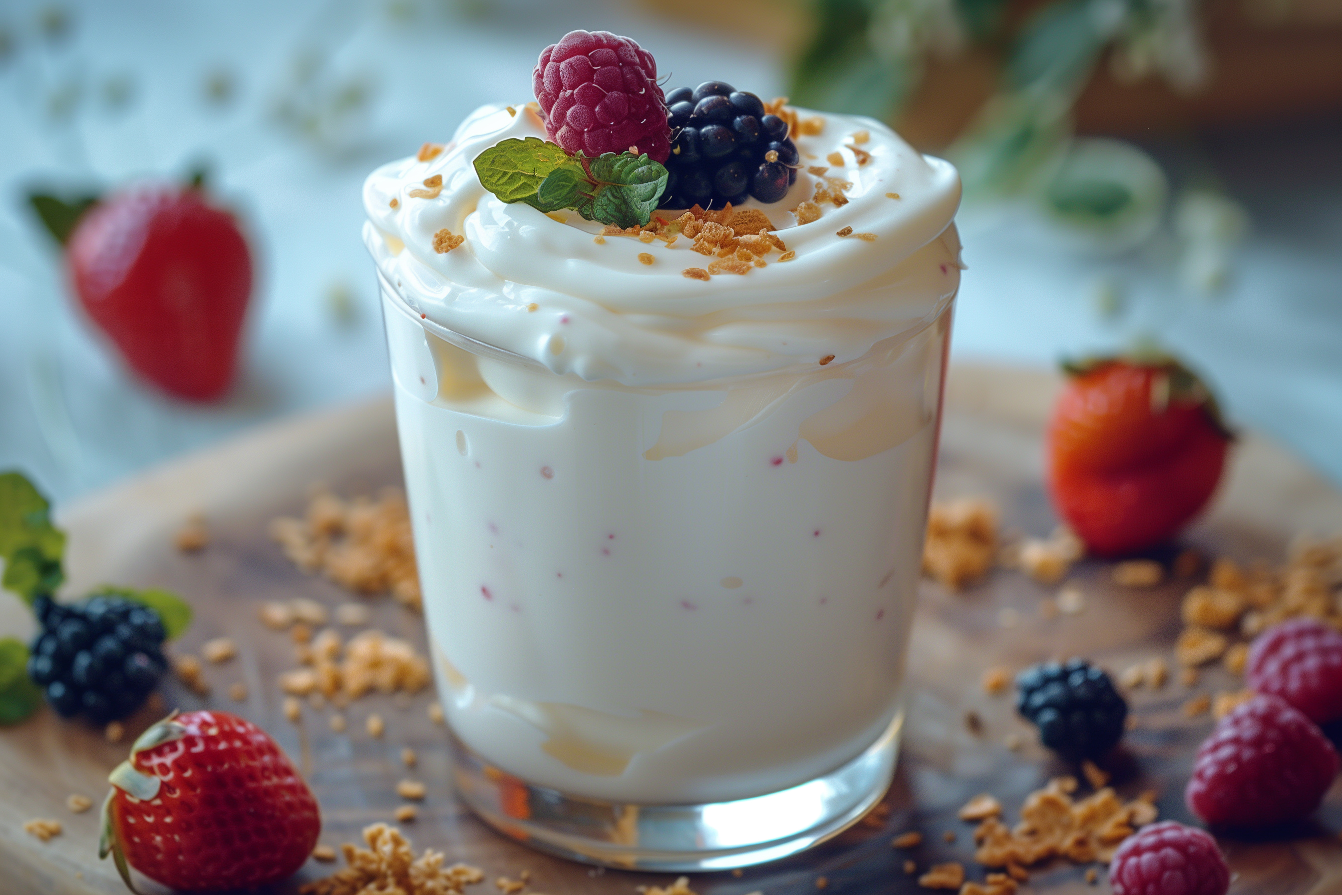 Dieses Foto zeigt ein leckeres und gesundes Beeriges Dessert in einem Glas. Der Becher ist mit cremigem, weißem Joghurt gefüllt und mit frischen, bunten Beeren wie Himbeeren, Brombeeren und Erdbeeren garniert. Dazu gibt es noch knusprige Granola-Brösel, die dem Ganzen eine zusätzliche Textur verleihen. Die Perspektive ist nah und fokussiert, sodass die Details der Zutaten deutlich zu sehen sind. Die Farben sind kräftig und verleihen dem Bild eine appetitliche Ausstrahlung. Dieses kostenloses Stockfoto in hoher Auflösung unter Creative-Commons-Lizenz eignet sich hervorragend für Blogs, Newsletter, Social-Media-Beiträge oder Werbematerialien rund um gesunde Ernährung, Frühstücksideen oder leckere Desserts.