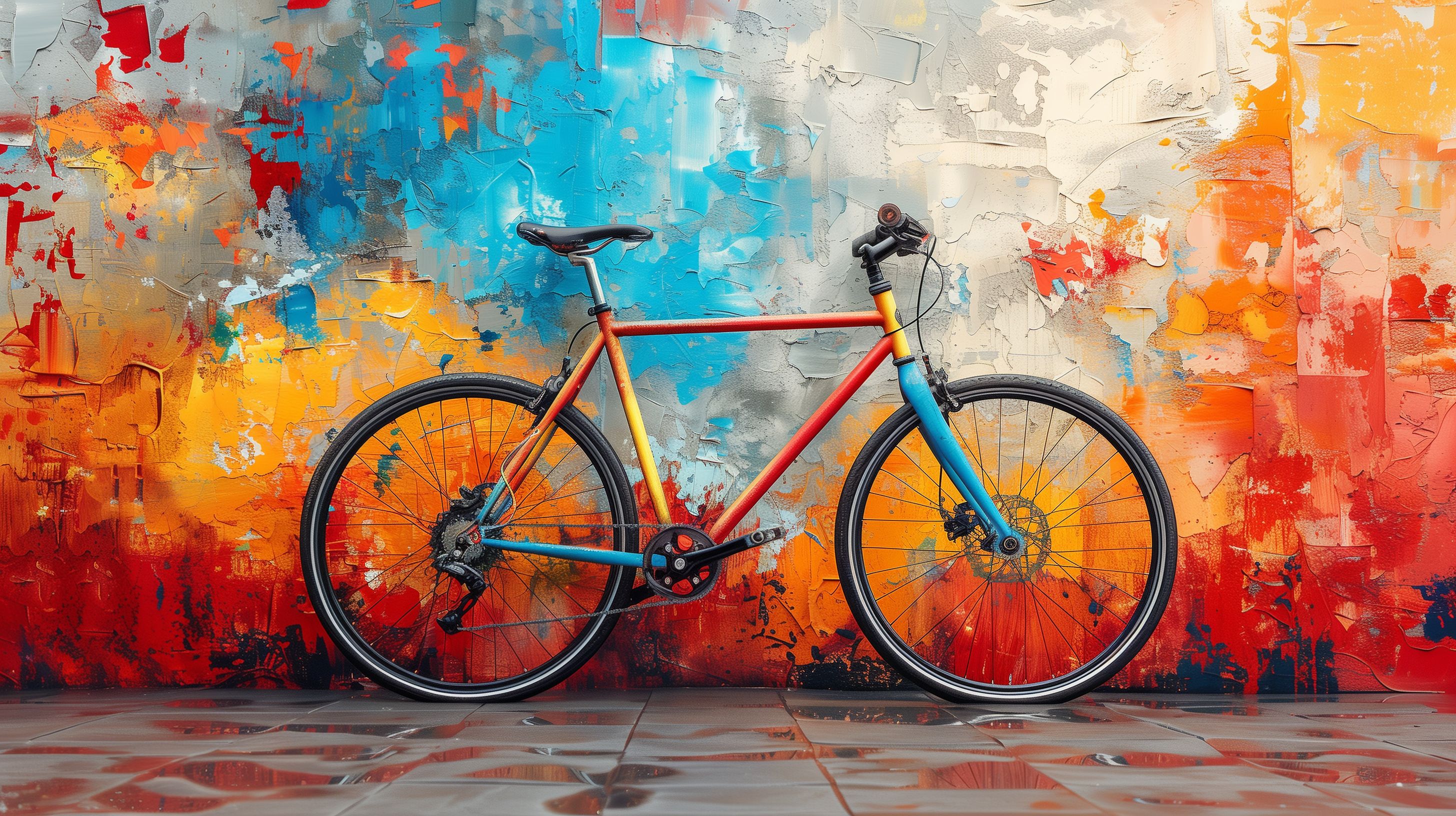 Dieses beeindruckende Foto zeigt ein farbenfrohes Fahrrad vor einem abstrakten Gemälde-Hintergrund. Das Fahrrad, in einem kräftigen Rot- und Blauton gehalten, sticht vor den dynamischen Farbspritzern und Pinselstrichen des Hintergrunds hervor. Die Komposition schafft einen spannenden Kontrast zwischen der funktionalen Form des Fahrrads und der expressiven, künstlerischen Gestaltung des Hintergrunds.