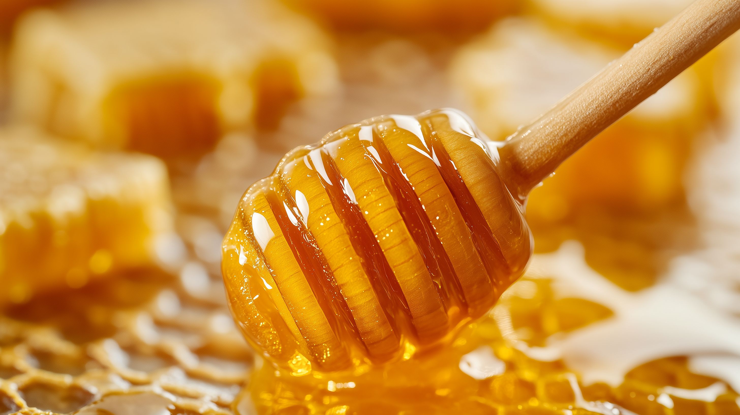 Dieses Foto zeigt eine detaillierte Nahaufnahme von frischem, goldenem Honig, der von einem Holzlöffel tropft. Die Waben-ähnliche Struktur des Honigs ist deutlich zu erkennen und verleiht dem Bild eine natürliche, organische Ästhetik. Die warmen, goldenen Farbtöne sowie die unscharfe, verschwommene Hintergrundkulisse lassen den Honig im Mittelpunkt stehen und unterstreichen seine Reinheit und Frische. Dieses hochauflösende Stockfoto eignet sich hervorragend für den Einsatz in Blogs, Newslettern, Social-Media-Beiträgen oder Werbematerialien im Bereich Lebensmittel, Naturkosmetik oder Gesundheit. Es steht unter der Creative-Commons-Lizenz zur kostenlosen Verwendung zur Verfügung.