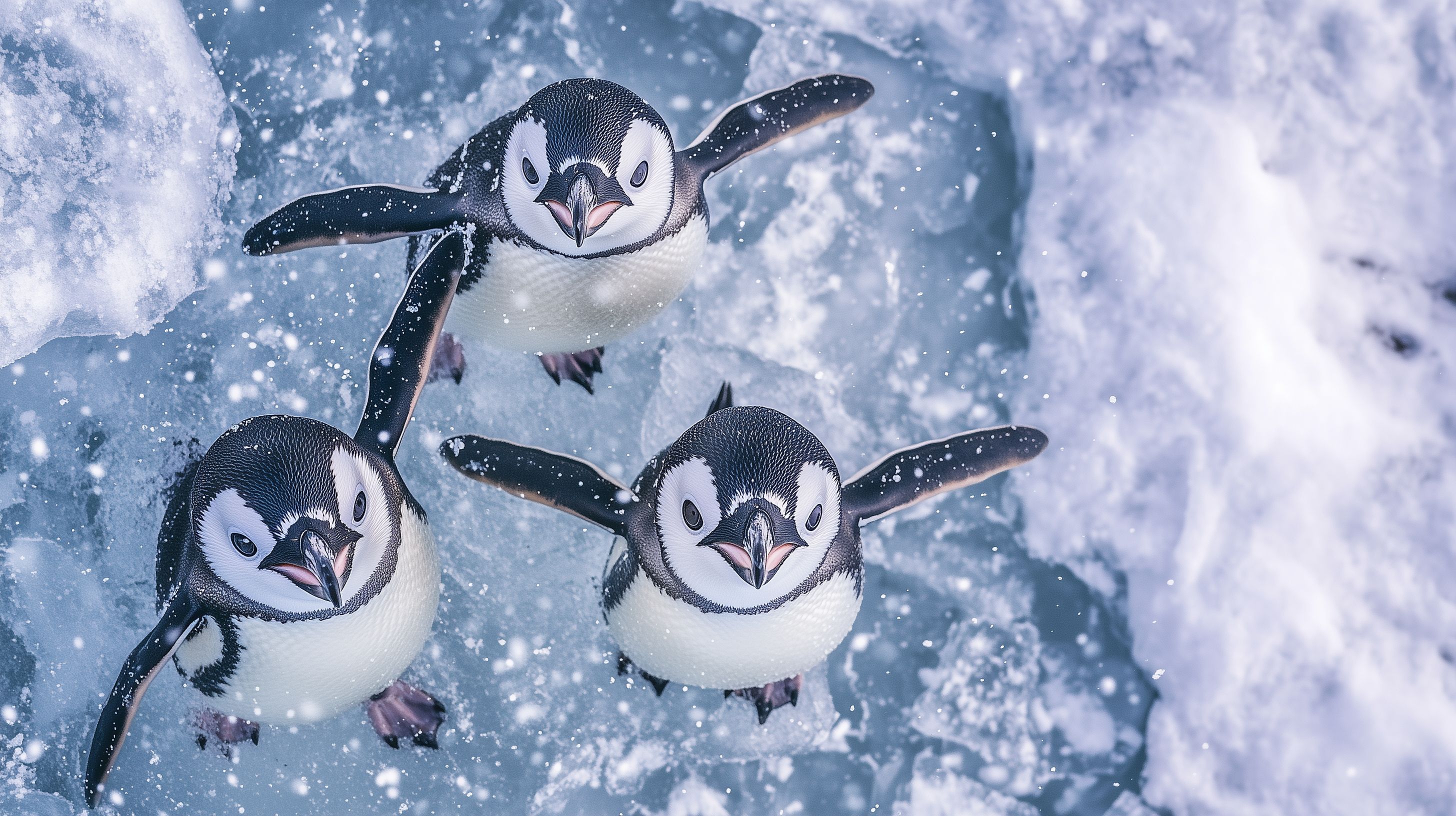 Das Foto zeigt eine Gruppe von Pinguinen, die durch einen Schneesturm auf einer verschneiten Eislandschaft watscheln. Die Pinguine haben ihre typischen schwarz-weißen Federn und sind in lebendiger Bewegung dargestellt, wie sie sich durch die wirbelnden Schneeflocken kämpfen. Die Szene vermittelt einen Eindruck von der rauen Schönheit der Antarktis und dem Überlebenswillen dieser faszinierenden Tiere. Dieses hochauflösende Foto eignet sich hervorragend für den Einsatz in Blogs, Newslettern, Social-Media-Beiträgen oder Werbekampagnen rund um Themen wie Natur, Tierwelt oder Winter.
