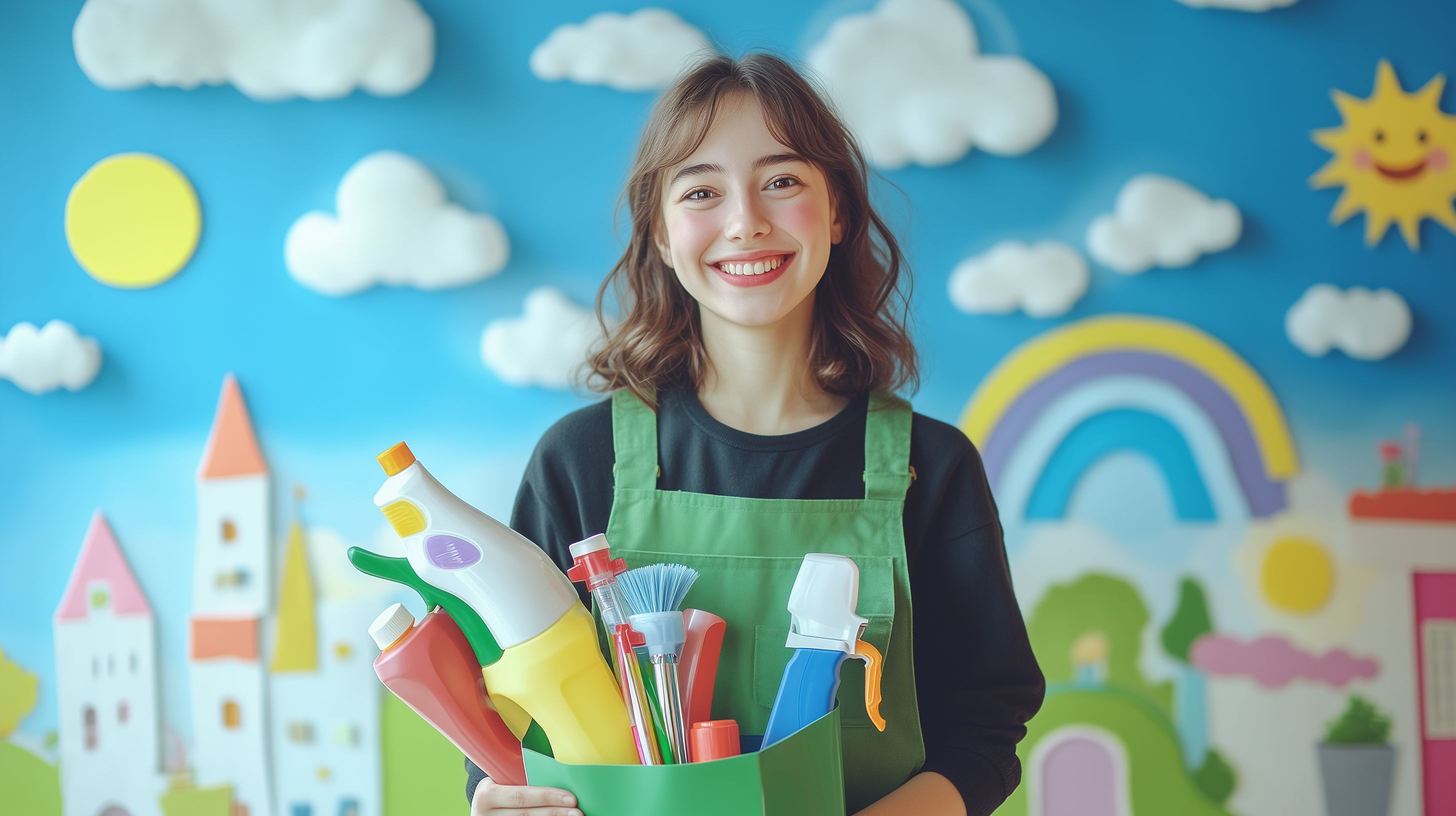 Das Bild zeigt eine fröhliche junge Frau, die Reinigungsmittel und Putzwerkzeuge in der Hand hält. Sie lächelt in die Kamera vor einem bunten, kindlichen Hintergrund mit Wolken, Sonne und Regenbogen. Die Szene vermittelt einen positiven, unbeschwerten Eindruck und könnte für Werbung, Blogbeiträge oder Social-Media-Inhalte rund um Themen wie Haushaltsführung, Ordnung und Reinigung verwendet werden. Als hochauflösendes, kostenloses Stockfoto unter Creative-Commons-Lizenz eignet es sich hervorragend für vielfältige Anwendungen.