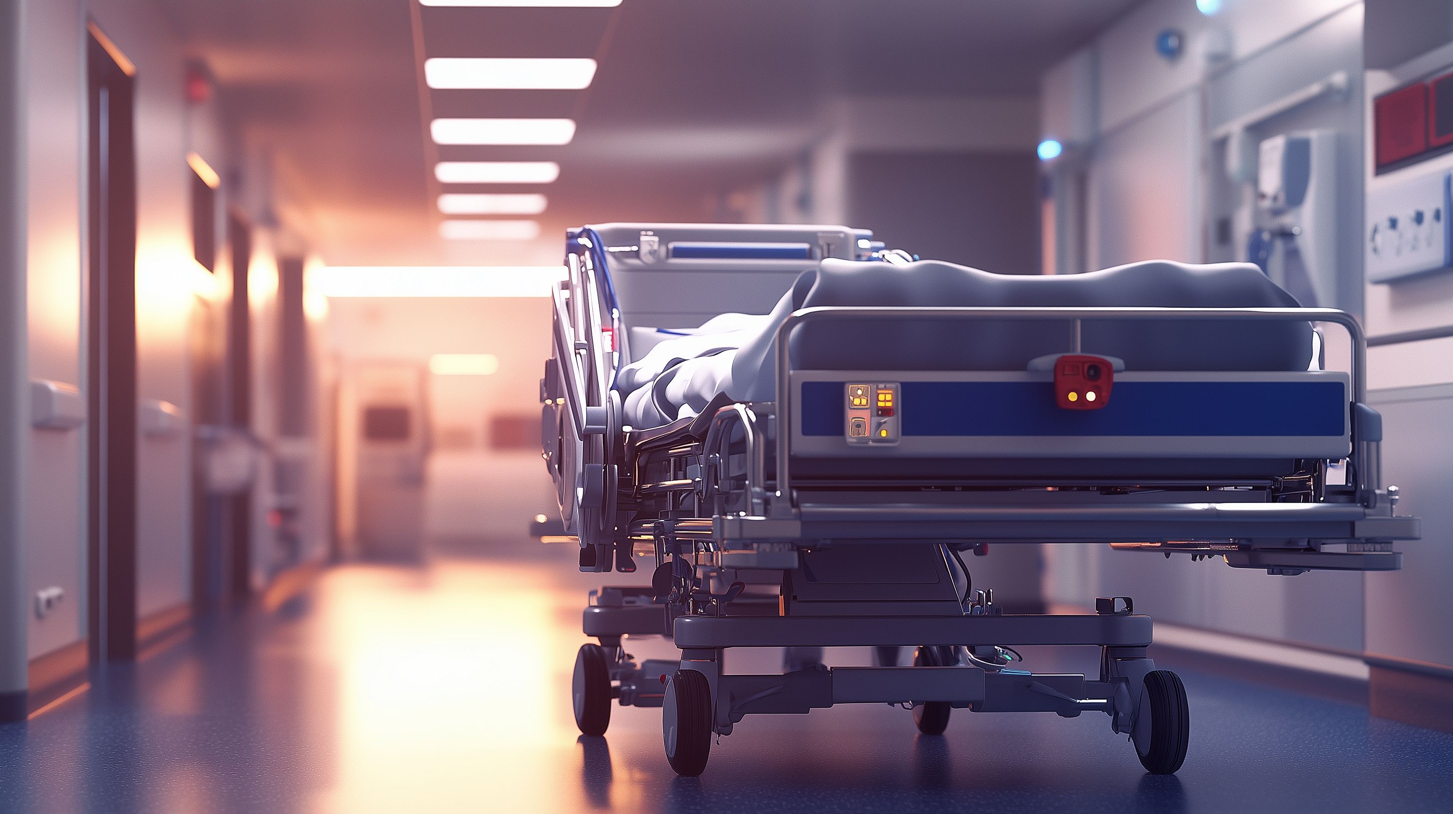 Das Bild zeigt ein leeres Krankenhausbett, das in einem beleuchteten Flur steht. Das Bett ist mit einem blauen Bezug ausgestattet und wirkt modern und funktional. Der Korridor ist hell erleuchtet, mit Deckenleuchten, die einen warmen, beruhigenden Farbton ausstrahlen. Das Bett steht alleine da, ohne weitere Patienten oder medizinisches Personal, was eine ruhige, fast verlassene Atmosphäre schafft. Das Foto vermittelt einen Eindruck von der sterilen, aber professionellen Umgebung eines Krankenhauses und könnte für Webseiten, Newsletter oder Werbekampagnen im Gesundheitswesen genutzt werden.