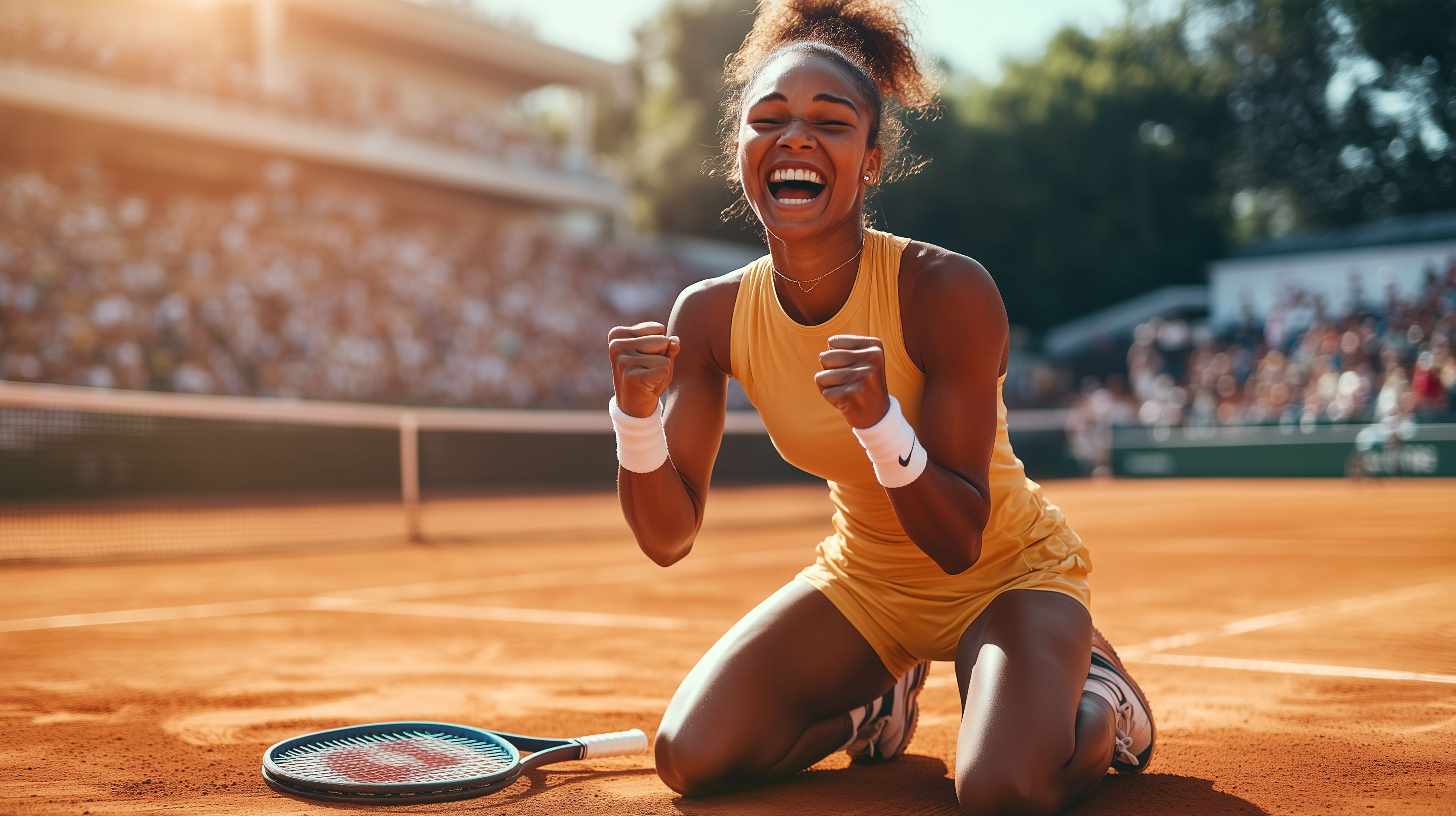 Das Bild zeigt eine Tennisspielerin, die triumphierend auf dem Sandplatz kniet und mit erhobenen Armen jubelt. Ihr Gesichtsausdruck strahlt pure Freude und Euphorie aus. Sie trägt ein gelbes Trikot und hat ihre dunklen Haare zu einem Dutt zusammengebunden. Im Hintergrund sind Zuschauer auf den Tribünen zu sehen, die den Sieg der Athletin bejubeln. Das Foto vermittelt eine energiegeladene und emotional aufgeladene Atmosphäre des Tennissports. Es eignet sich hervorragend als kostenloses Stockfoto für Blogs, Newsletter oder Social-Media-Beiträge rund um Themen wie Sport, Motivation, Erfolg und Leistungsfähigkeit. Die hohe Bildqualität und der kreative Bildausschnitt machen das Foto zu einem echten Hingucker, das unter einer Creative-Commons-Lizenz frei verwendbar ist.