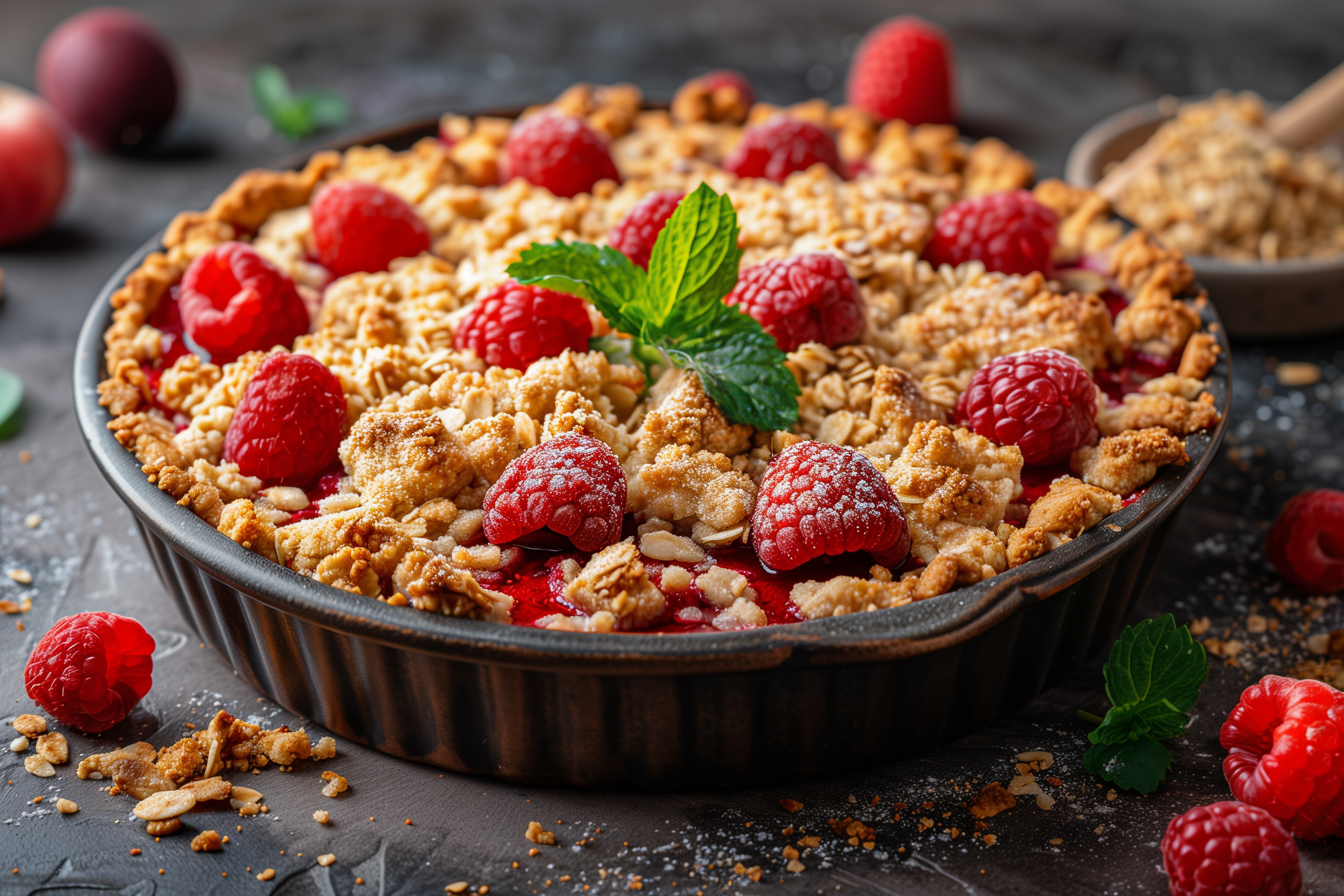 Das Foto zeigt ein leckeres Beerenkrumeltörtchen in einer schwarzen Backform. Die Oberfläche ist mit roten, reifen Himbeeren und Erdbeeren übersät und mit frischer Minze garniert. Der Teig hat eine goldbraune, knusprige Kruste und der Streusel eine schöne, krümelige Struktur. Das Dessert wurde vor einem dunklen Hintergrund aufgenommen, wodurch die Farben kräftig hervorstechen. Dieses Bild eignet sich perfekt als kostenloses Stockfoto für Blogs, Newsletter, Social-Media-Beiträge oder Werbematerialien rund um das Thema Backen, Kochen und Essen in hoher Auflösung unter der Creative-Commons-Lizenz.