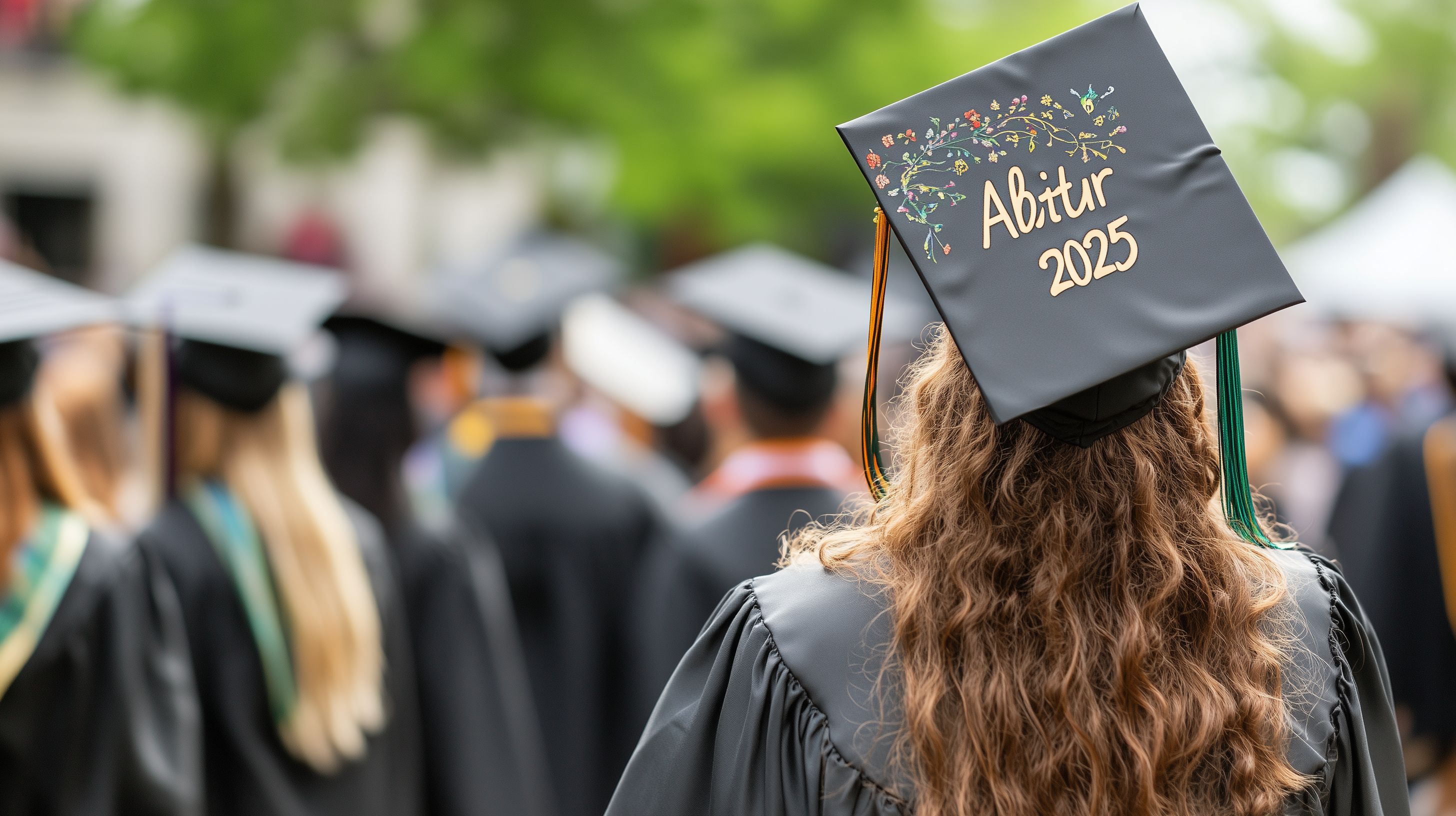 Das Bild zeigt eine Absolventin, die ihren Absolventenabschluss 2025 mit einem verzierten Hut in einer grünen, natürlichen Umgebung feiert. Der Hut trägt die Aufschrift 'Abitur 2025', was auf den erfolgreichen Abschluss der Hochschulreife hindeutet. Die Absolventin steht inmitten einer Menge von anderen Absolventen, die ebenfalls ihre Abschlüsse feiern. Das Bild vermittelt eine feierliche und triumphale Stimmung und eignet sich hervorragend als kostenloses Stockfoto für Werbung, Social Media und Bildungsmaterialien in hoher Auflösung unter einer Creative Commons-Lizenz.