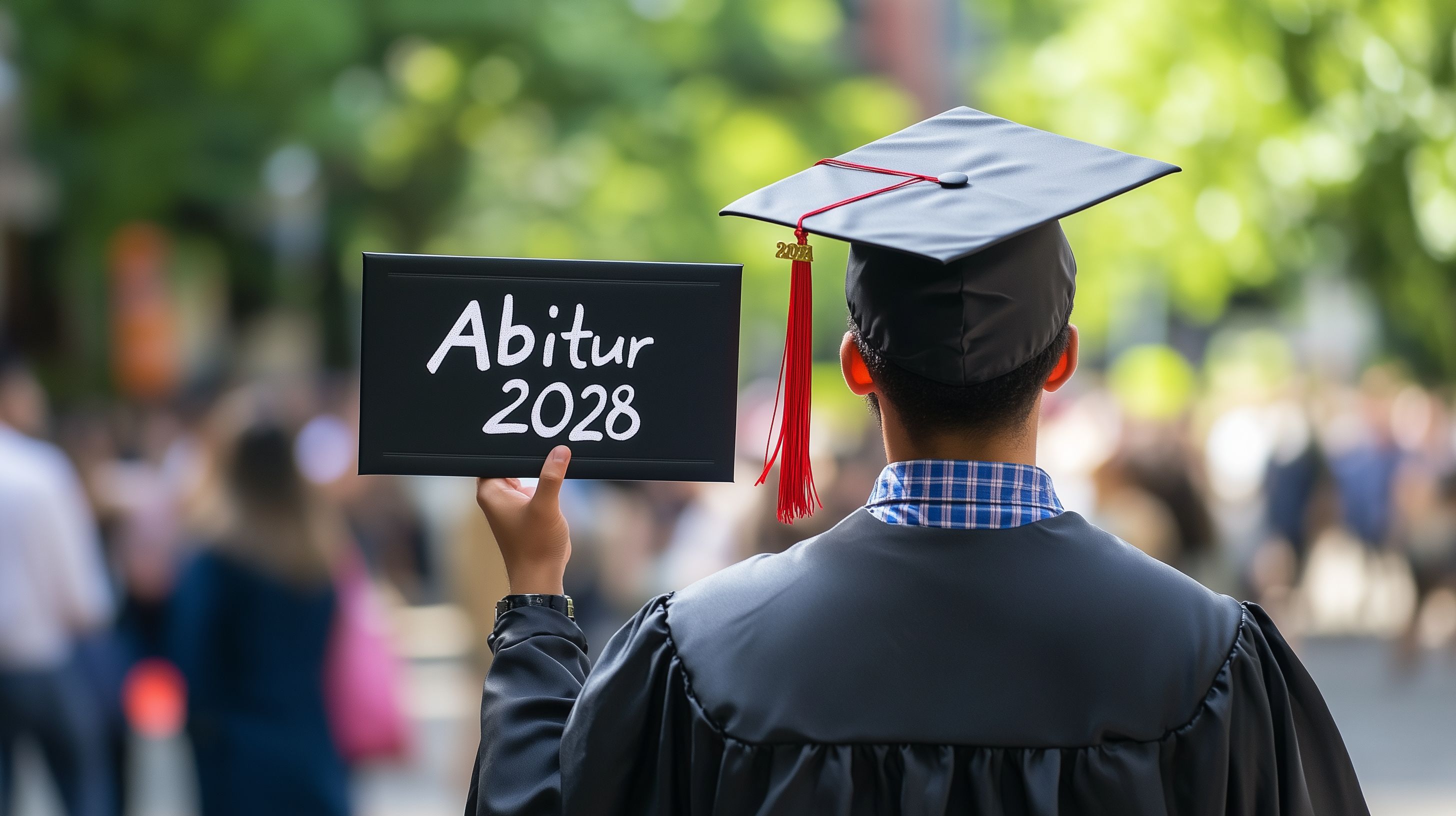 Das Bild zeigt einen Studierenden, der stolz seinen Abitur-Abschluss für das Jahr 2028 auf einer Tafel präsentiert. Der junge Mann trägt eine schwarze Graduierungstoga mit rotem Quast und steht vor einer grünen, natürlichen Umgebung. Das Bild vermittelt einen Eindruck von Erfolg, Stolz und Vorfreude auf den bevorstehenden Abschluss. Dieses hochauflösende, kostenlose Stockfoto eignet sich hervorragend für Beiträge in Blogs, Newslettern oder Social-Media-Kanälen rund um Themen wie Bildung, Karriere und Lebensmeilensteine. Es steht unter einer Creative-Commons-Lizenz zur freien Verwendung zur Verfügung.