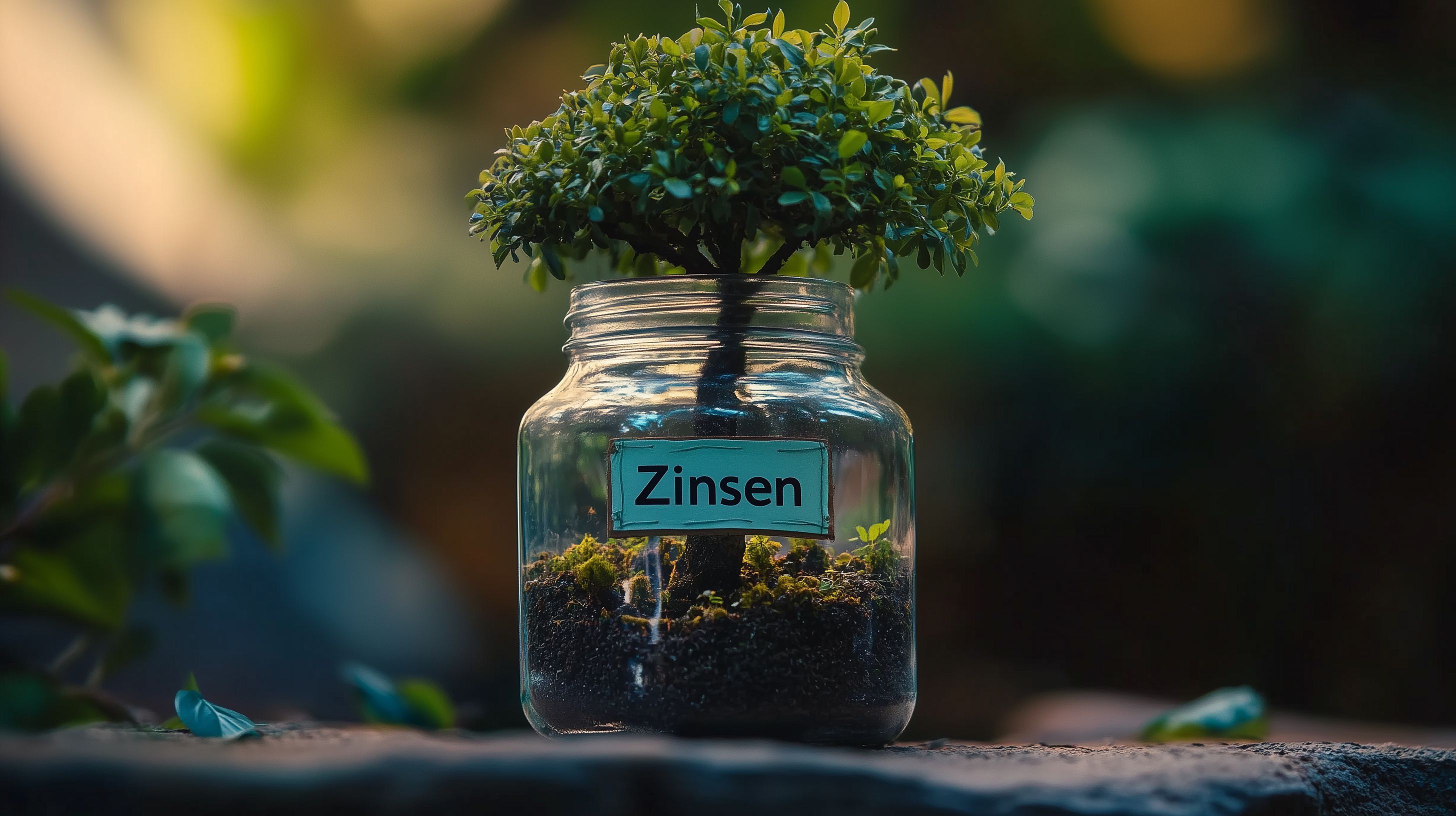 Das Foto zeigt ein Glasgefäß, in dem eine kleine Baumpflanze wächst. Der Glasbehälter trägt das Etikett 'Zinsen', was auf den finanziellen Ertrag und die Geldanlage als Symbolik für das Wachstum und den Erfolg hindeutet. Die grüne, frisch wirkende Pflanze im Glasgefäß repräsentiert die Nachhaltigkeit und das Potenzial für Wachstum und Ertrag. Dieses Bild eignet sich ideal für den Einsatz in Blogs, Newslettern, Social-Media-Posts oder Werbematerialien zu Themen wie Finanzen, Geldanlage, Investitionen oder nachhaltiges Wirtschaften. Als kostenloses, hochauflösendes Stockfoto unter Creative-Commons-Lizenz kann es vielfältig genutzt werden.
