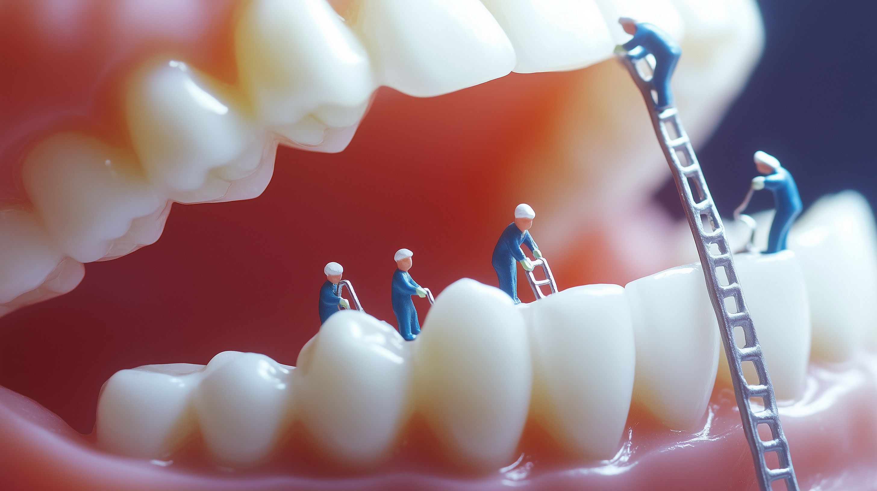 Dieses detaillierte Foto zeigt ein Zahnmodell mit miniaturisierten Figuren, die an den Zähnen arbeiten. Die leuchtend rote Darstellung der Zahnfleischpartien und der weiße, makellose Zahnschmelz kontrastieren eindrucksvoll. Die kleine Leiter an der Seite unterstreicht den professionellen, wissenschaftlichen Charakter der Illustration. Dieses hochauflösende Stockfoto eignet sich hervorragend für Artikel und visuelle Inhalte rund um Zahnmedizin, Gesundheit und die medizinische Branche. Es ist unter einer Creative Commons-Lizenz verfügbar und kann kostenfrei für verschiedenste Zwecke, wie Blogs, Newsletter oder Werbung, genutzt werden.