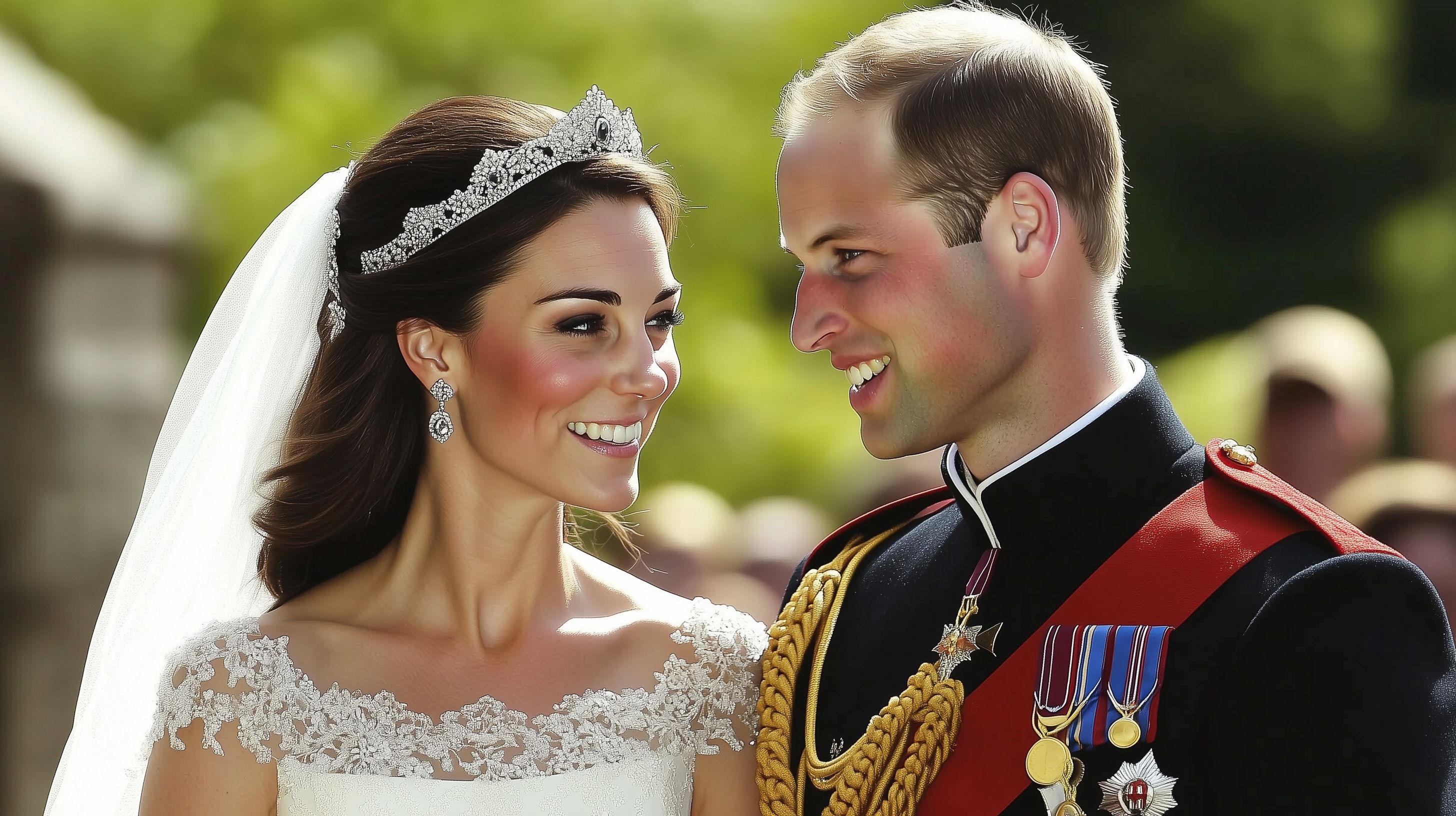 Das Foto zeigt ein romantisches Hochzeitsbild eines königlichen Paares. Im Vordergrund sieht man die Braut, die in einem prachtvollen, spitzenverzierten Brautkleid gekleidet ist und eine funkelnde Tiara trägt. Ihr Bräutigam steht neben ihr in einer militärischen Uniform und strahlt sie glücklich an. Der Hintergrund ist von üppiger, grüner Vegetation geprägt, die den festlichen Charakter der Szene unterstreicht. Das Bild vermittelt eine Atmosphäre der Liebe, Tradition und Feierlichkeit. Als kostenloses Stockfoto in hoher Auflösung eignet es sich hervorragend für Hochzeitsanzeigen, Blogger-Beiträge, Social-Media-Posts oder Werbekampagnen unter der Creative-Commons-Lizenz.