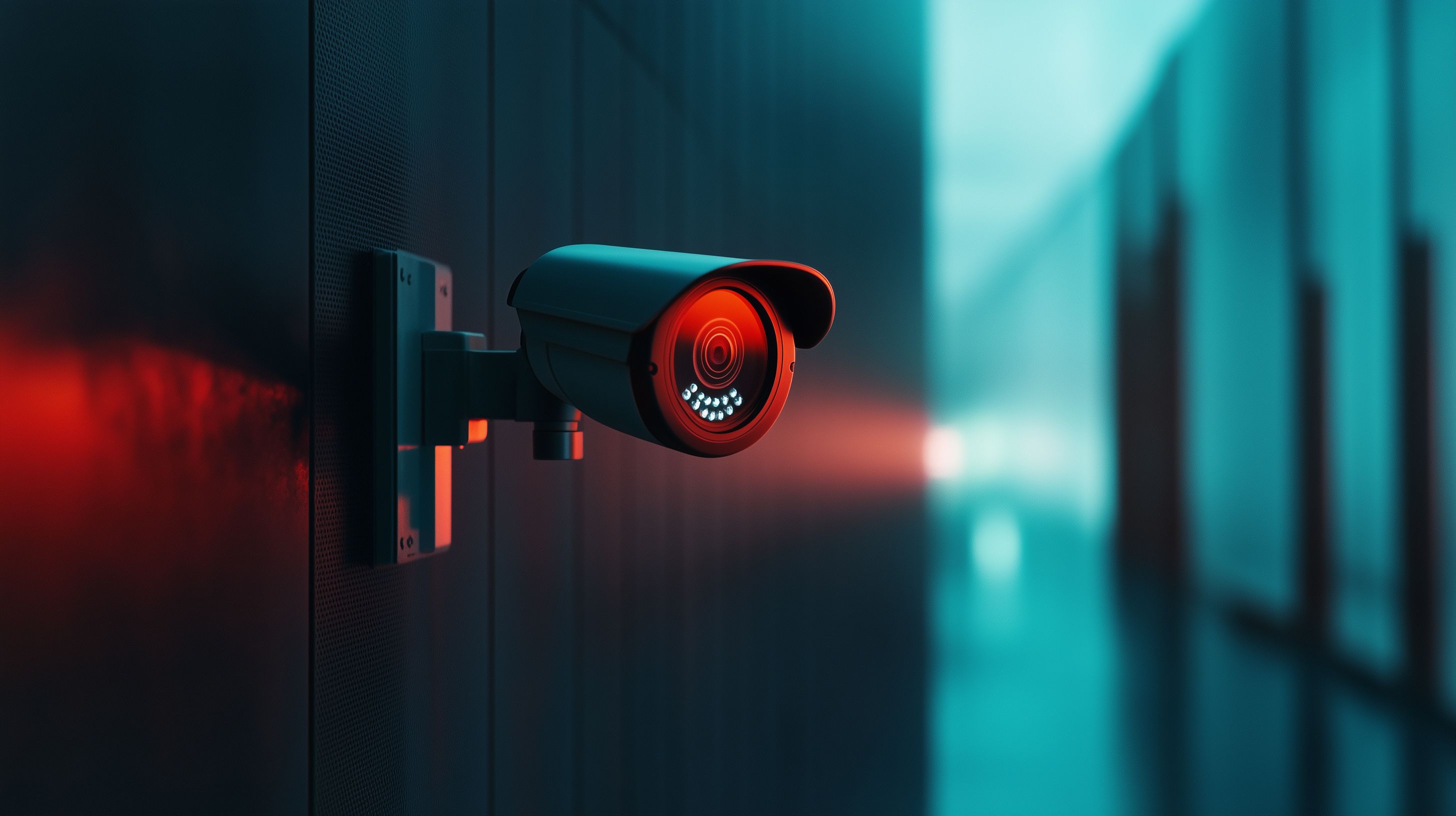 Das Bild zeigt eine hochmoderne Überwachungskamera, die an einer dunklen Wand montiert ist. Die Kamera ist in einem matten Schwarz gehalten und hat ein orangerotes Objektiv, das einen markanten Kontrast zur bläulich-grünen Umgebung bildet. Die Kamera ist so positioniert, dass sie den gesamten Raum im Blick hat und ein hohes Maß an Sicherheit gewährleistet. Dieses Stockfoto eignet sich hervorragend für Blogbeiträge, Newsletter oder Social-Media-Postings rund um das Thema Sicherheit, Überwachungstechnik oder Datenschutz. Es ist in hoher Auflösung verfügbar und unter einer Creative-Commons-Lizenz lizenziert, sodass es kostenfrei für viele Anwendungen genutzt werden kann.