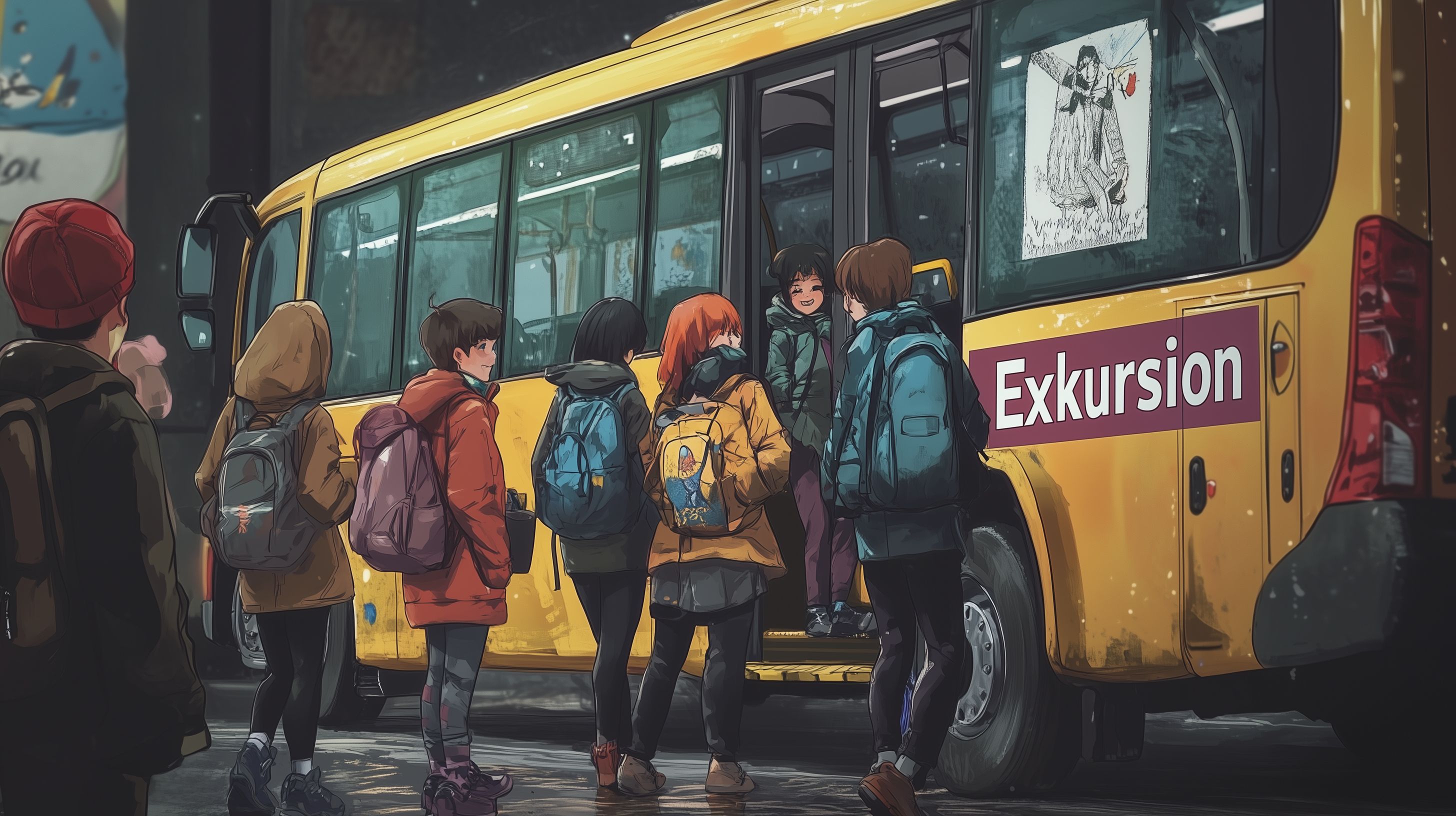 Dieses stimmungsvolle Bild zeigt eine Gruppe von Schülern, die gerade dabei sind, in einen gelben Schulbus einzusteigen. Die Kinder tragen bunte, funktionale Jacken und Rucksäcke, was darauf hindeutet, dass sie sich auf eine Exkursion oder einen Ausflug vorbereiten. Die Szene spielt sich auf einer Stadtstraße ab, mit Gebäuden im Hintergrund, die eine urban-industrielle Atmosphäre vermitteln.
