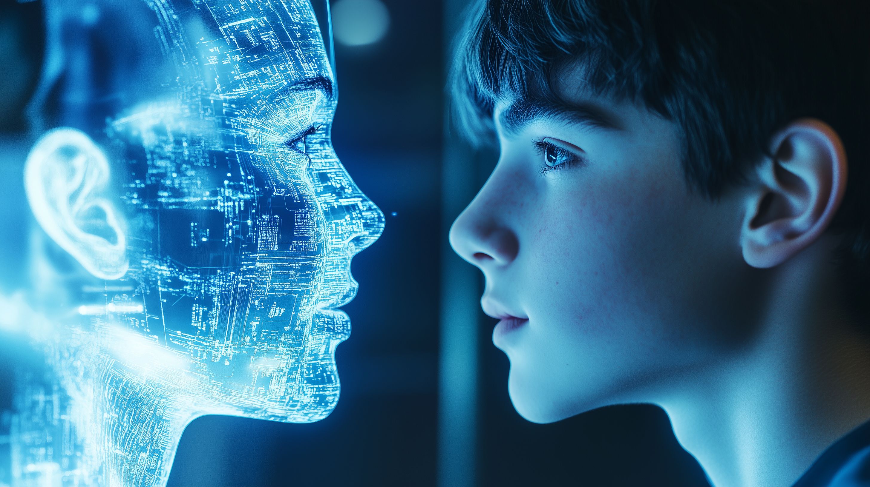 Das faszinierende Foto zeigt einen jungen Jungen, der in tiefe Gedanken versunken mit seinem digitalen Spiegelbild zu kommunizieren scheint. Das holografische Abbild ist von technischen Elementen und leuchtenden Linien umgeben, was eine futuristische und hochmoderne Atmosphäre schafft. Die Beleuchtung in kühlen Blautönen verleiht der Szene eine mystische und geheimnisvolle Stimmung. Dieses Bild eignet sich hervorragend für Anwendungen im Bereich Digitalisierung, Technologie und Zukunftsvisionen, sei es für Blogartikel, Social-Media-Beiträge oder Werbematerialien. Hochauflösend und unter einer Creative-Commons-Lizenz verfügbar, lässt es sich ideal in verschiedensten Kontexten einsetzen.