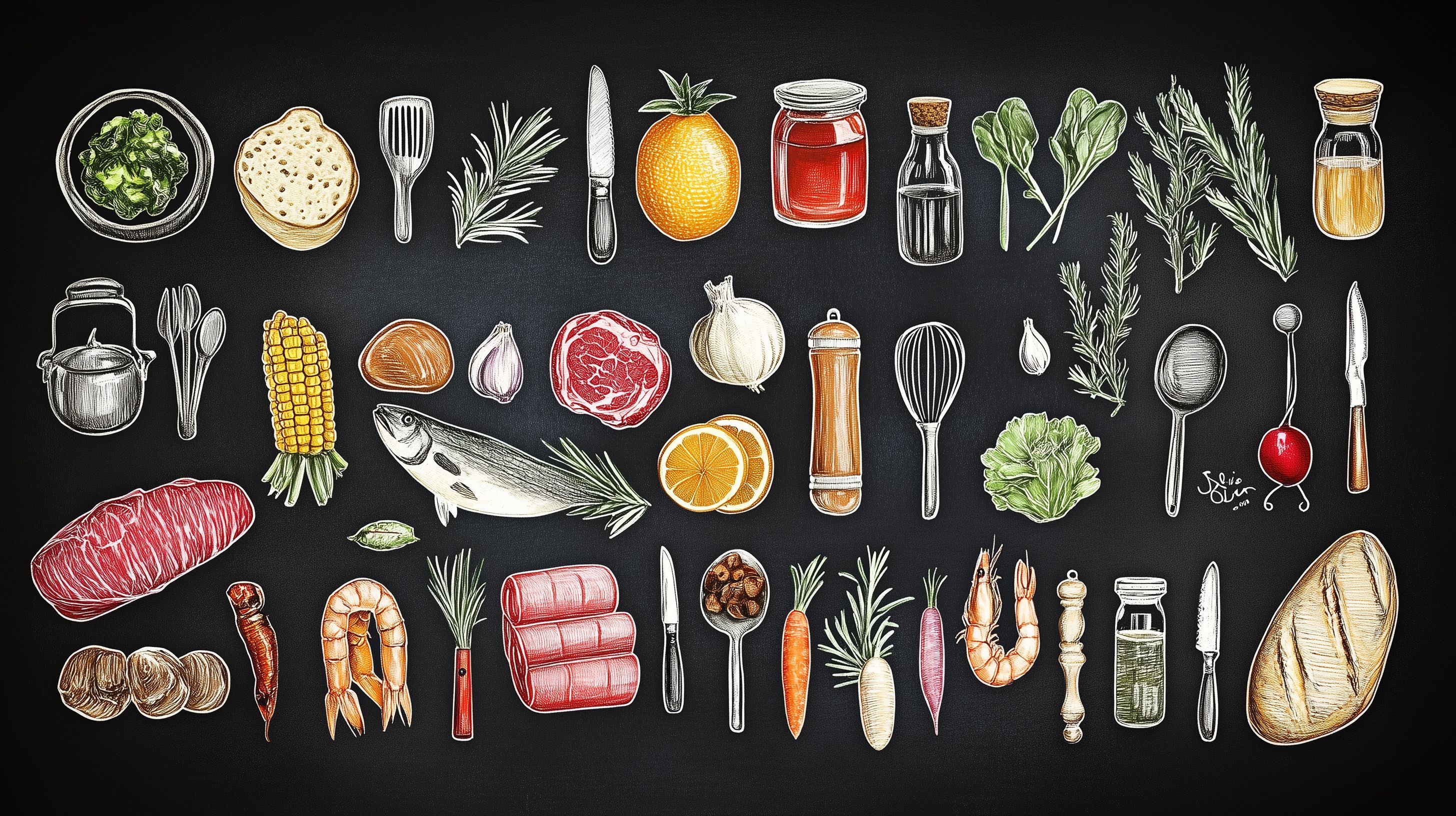 Dieses detaillierte und stimmungsvolle Bild zeigt eine rustikale Tafel mit einer Vielzahl an köstlichen Lebensmitteln und Küchenutensilien. Die handgezeichneten Illustrationen auf der dunklen Kreidetafel-Optik vermitteln einen authentischen, handwerklichen Charakter und schaffen eine einladende, natürliche Atmosphäre. Das Foto eignet sich hervorragend für den Einsatz in Kochrezepten, Foodblogs, Werbematerialien oder Kochbüchern. Als hochwertiges, kostenloses Stockfoto unter Creative-Commons-Lizenz ist es vielseitig und kreativ nutzbar.