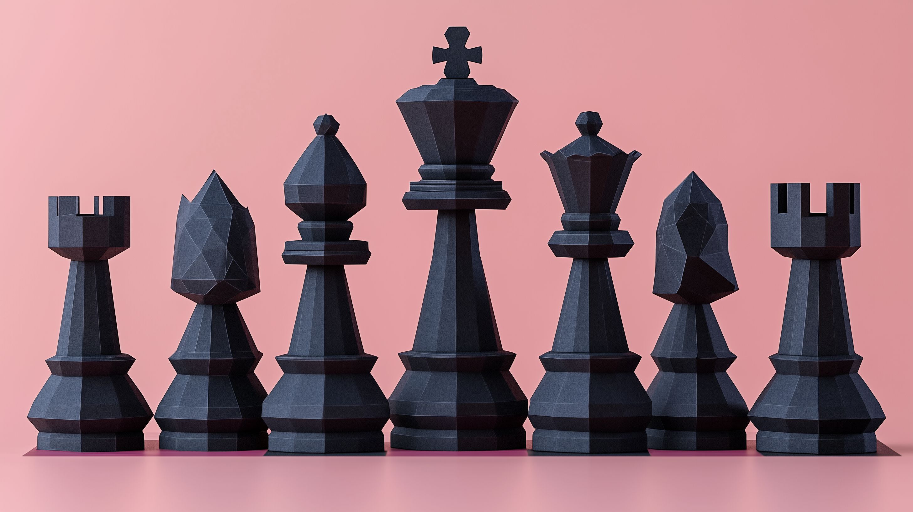 Das Bild zeigt eine Reihe von geometrischen Schachfiguren in einer dunklen Farbpalette auf einem hellen rosa Hintergrund. Die Figuren haben eine minimalistische, kubische Form mit scharfen Kanten und Konturen, die einen modernen und stilisierten Eindruck vermitteln. Die Anordnung der Figuren, von den Bauern bis hin zum König, suggeriert eine strategische Ausrichtung und lädt den Betrachter ein, über mögliche Spielzüge und Spielstrategien nachzudenken.