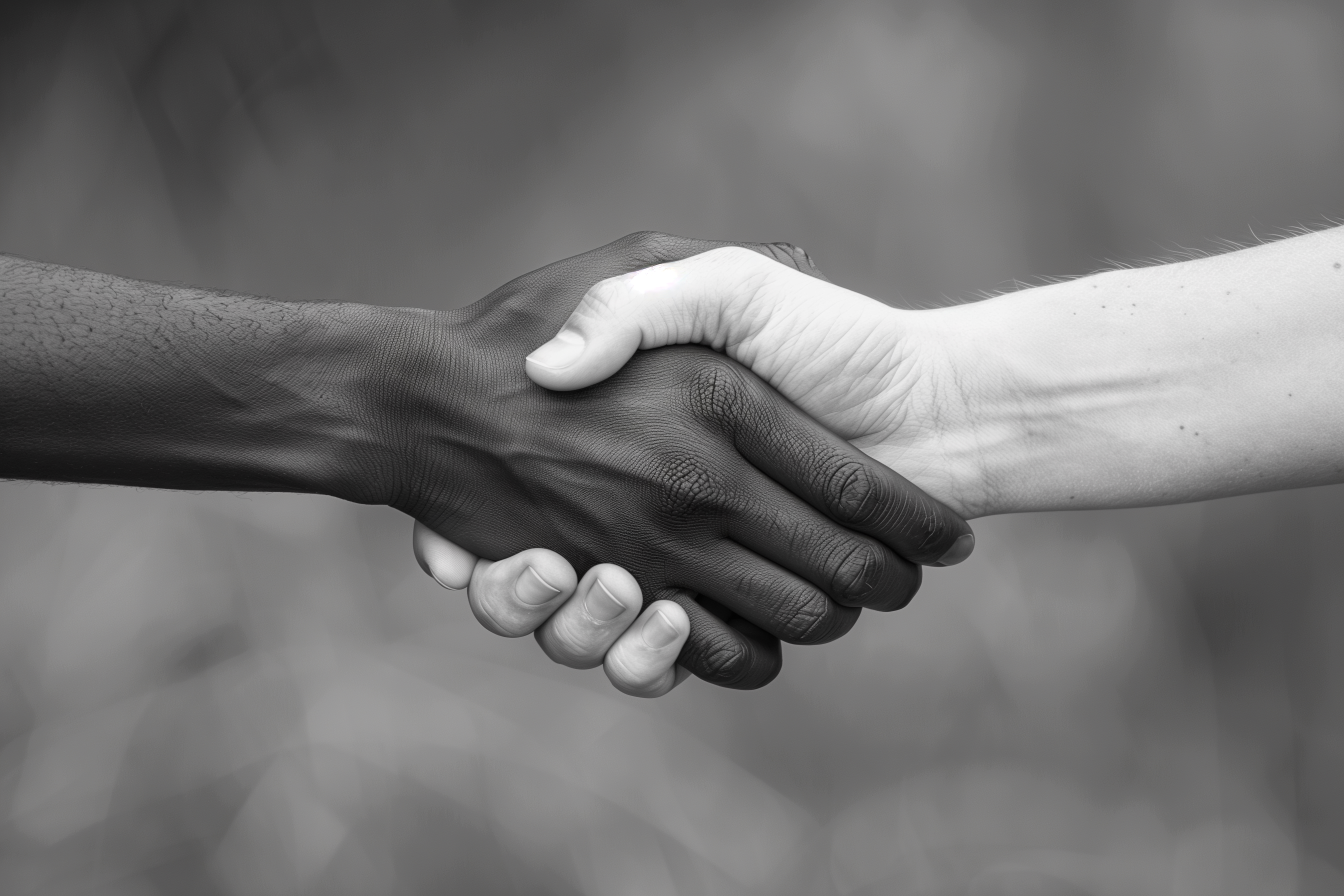 Dieses Schwarz-Weiß-Foto zeigt einen Handschlag zwischen einer hellen und einer dunklen Hand. Die Perspektive ist nah, was die Geste des Händeschüttelns und den Kontrast zwischen den Hautfarben betont. Das Bild vermittelt Themen wie Diversität, Zusammenarbeit und sozialen Zusammenhalt. Es könnte für Blogbeiträge, Werbematerial oder Sozialkampagnen verwendet werden, die Gleichberechtigung, Integration und respektvolle zwischenmenschliche Beziehungen fördern. Dieses hochauflösende Stockfoto steht unter einer Creative-Commons-Lizenz kostenlos für verschiedene Einsatzzwecke zur Verfügung.