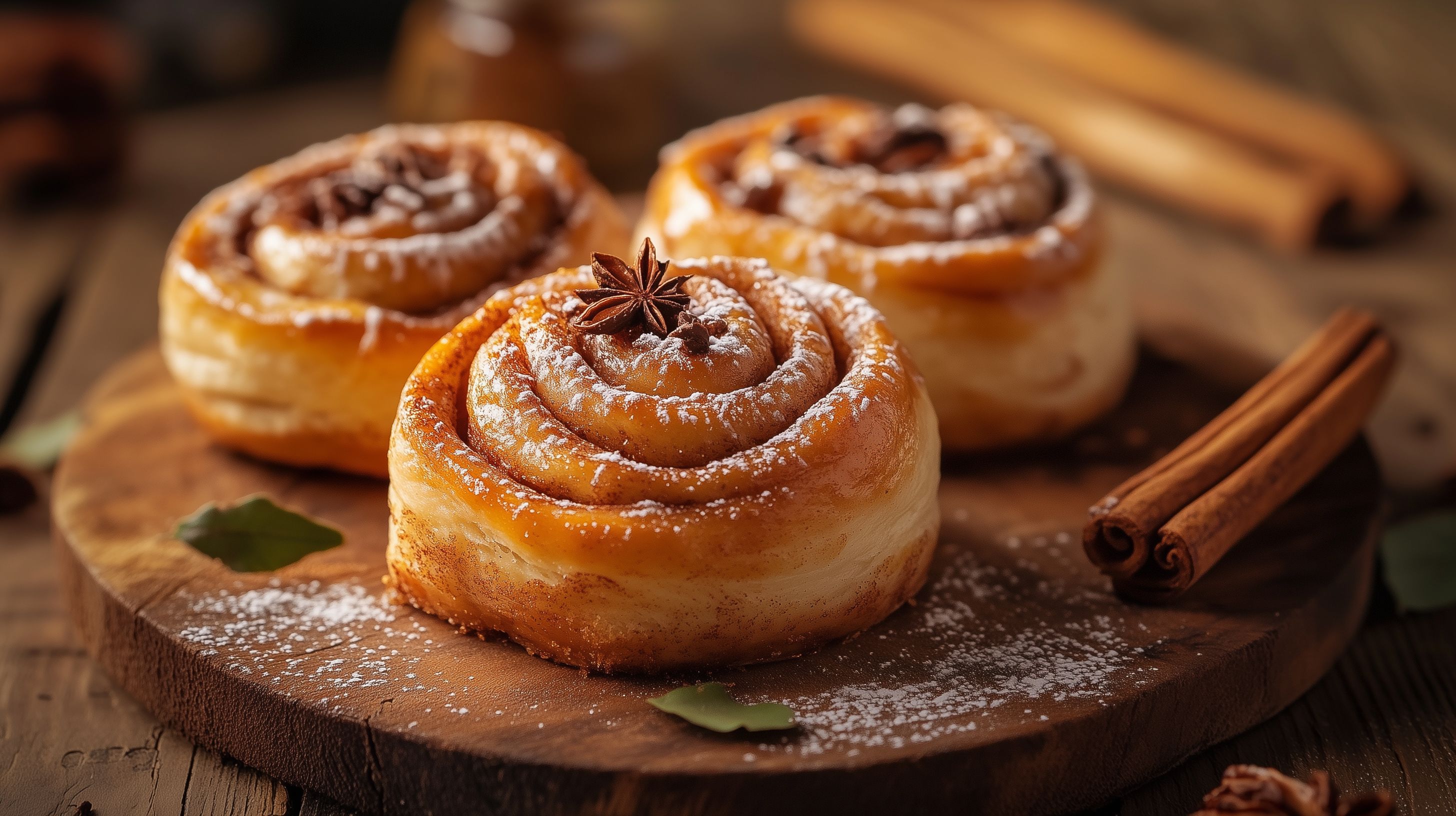 Dieses Bild zeigt eine Nahaufnahme von frisch gebackenen Zimtschnecken auf einem rustikalen Holzbrett. Die leckeren Leckereien sind mit Zimtglasur überzogen und mit Sternanis verziert, was ihnen einen wunderbar weihnachtlichen und festlichen Charakter verleiht. Die Zimtschnecken sind vor einem dunklen Hintergrund angerichtet, was ihre warmen, erdigen Farbtöne optimal zur Geltung bringt. Dieses stimmungsvolle Foto eignet sich hervorragend als kostenloses Stockfoto für Beiträge zu Themen wie Backen, Weihnachten, Gastrotextilien oder allgemein leckere Backwaren. Das hochauflösende Bild steht unter einer Creative-Commons-Lizenz zur freien Verwendung bereit.